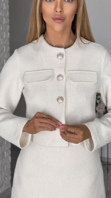 M/L: Švarko ilgis 46cm, krūtinė 50cm x 2, rankovės 61cm. Sijono ilgis 40cm, liemuo 33cm x 2, klubai 45cm x 2.