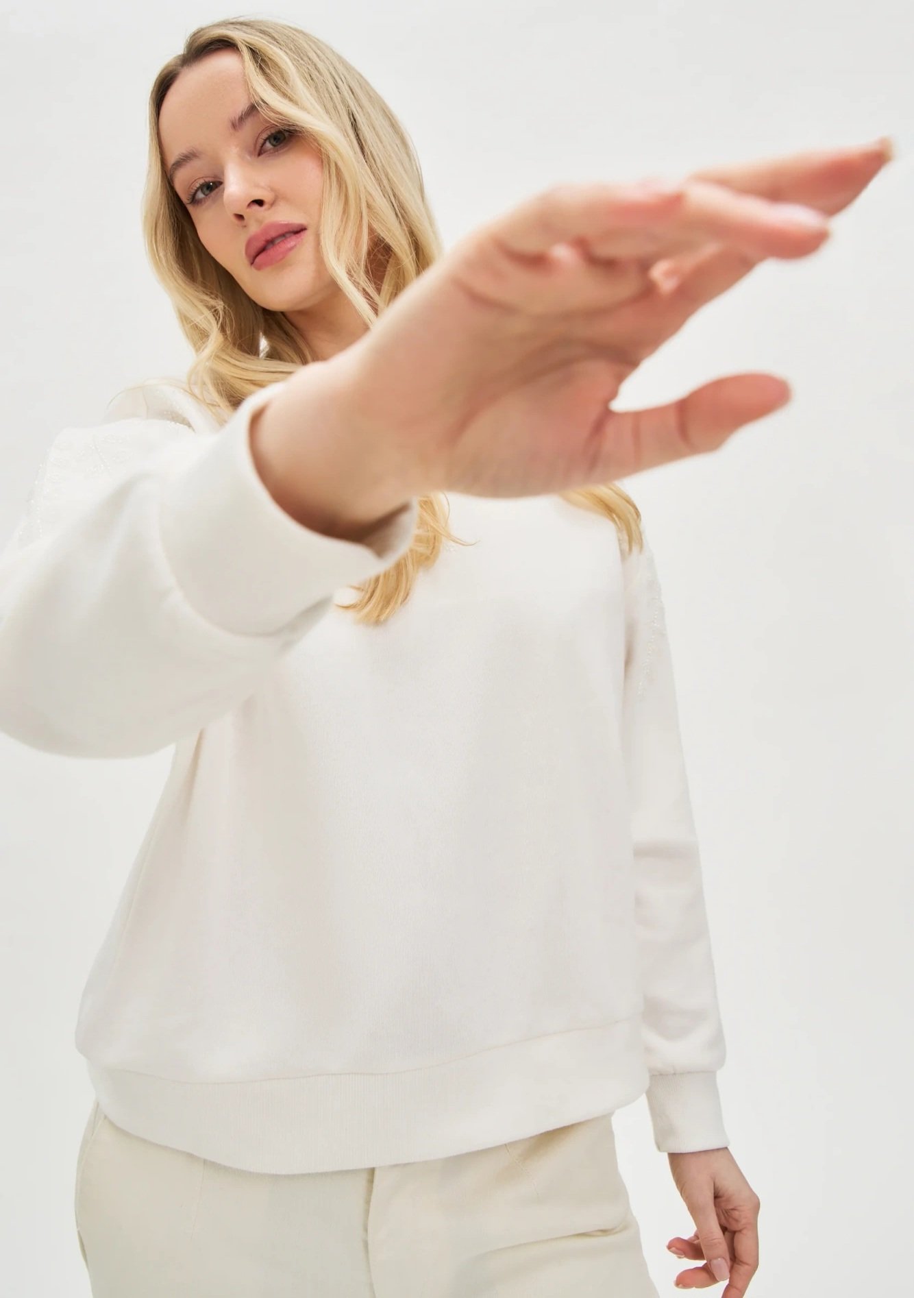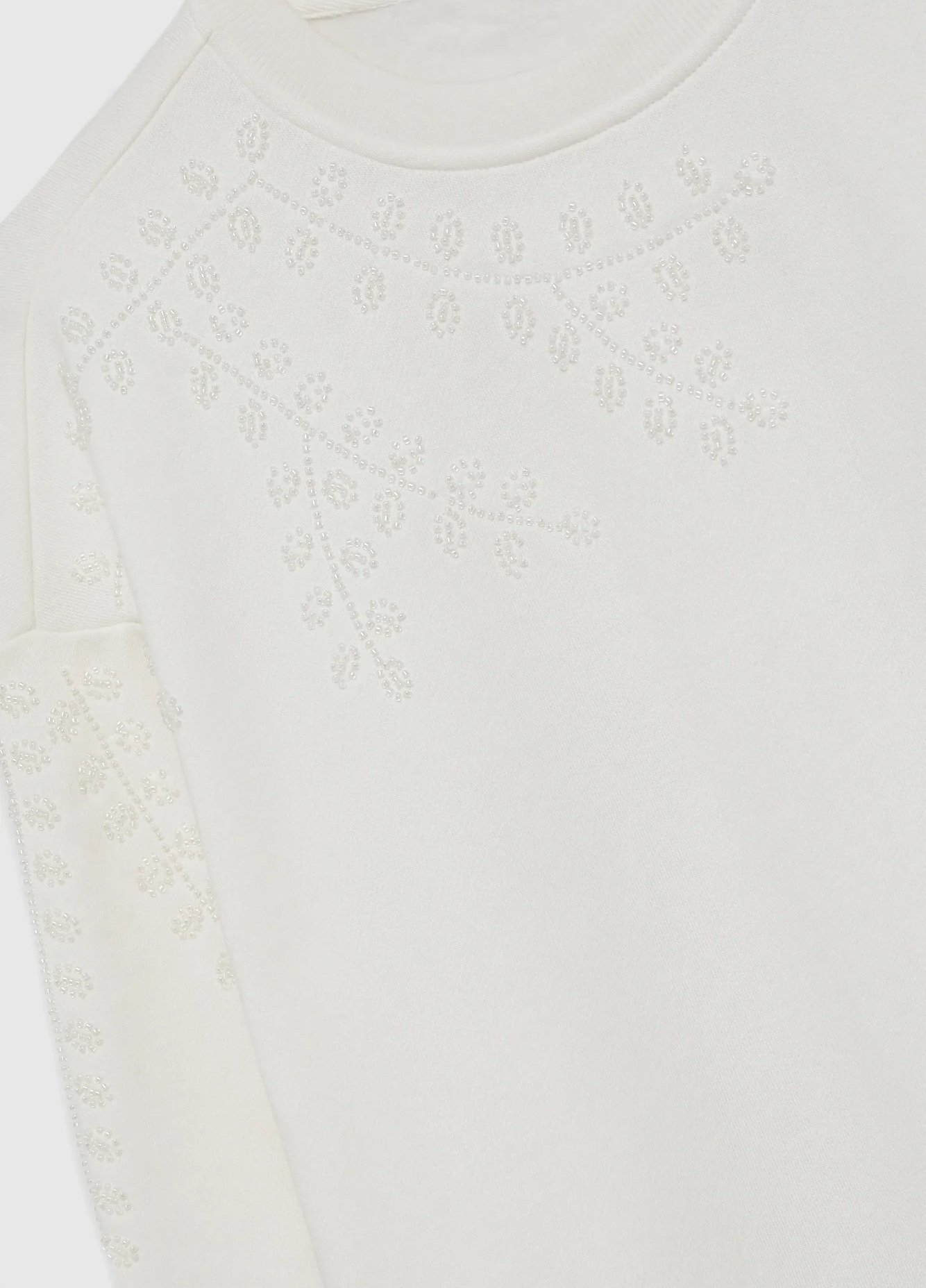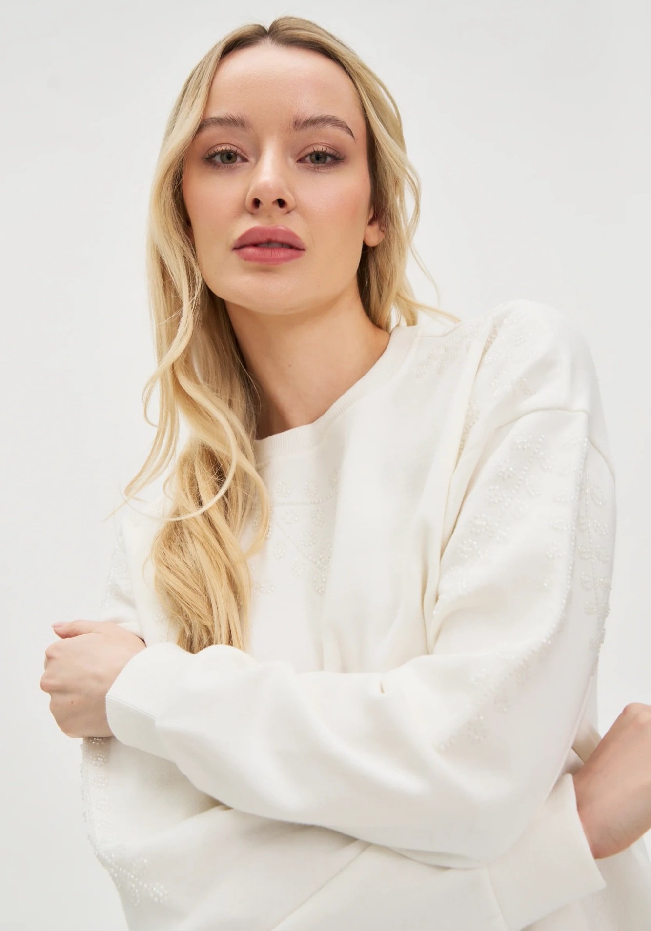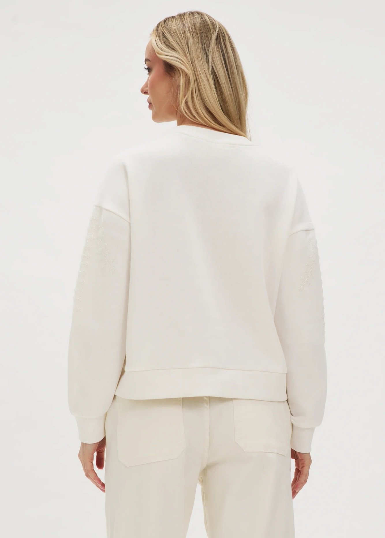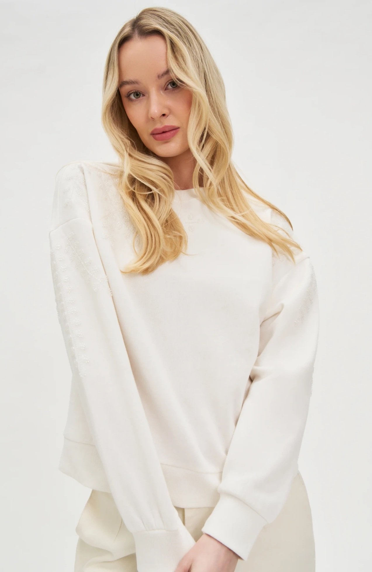 Džemperis dekoruotas karoliukais. Ilgos rankovės. Viduje yra švelnus pūkelis.