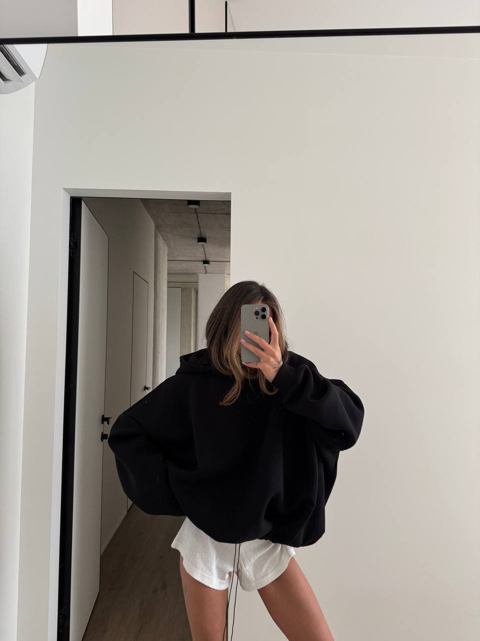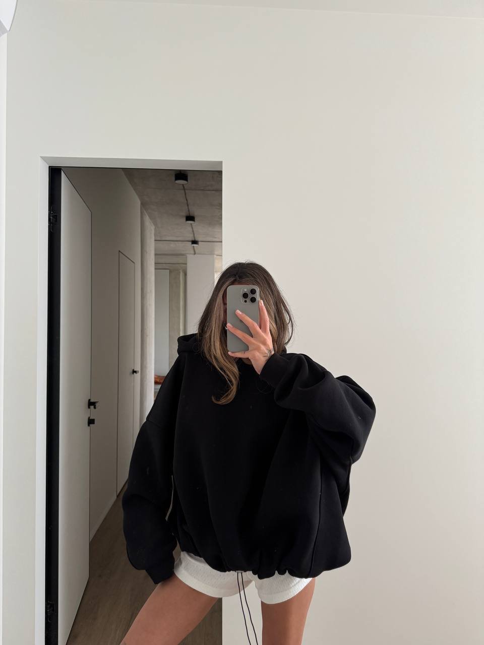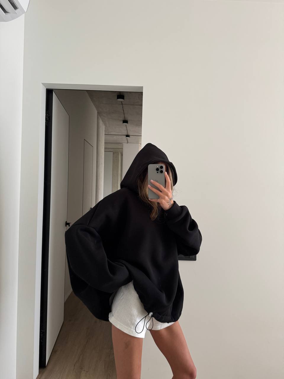 Oversize stiliaus džemperis. 100% medvilnė. Viduje yra švelnus pūkelis. Ilgos rankovės. Apačioje reguliuojasi. Juodos spalvos.