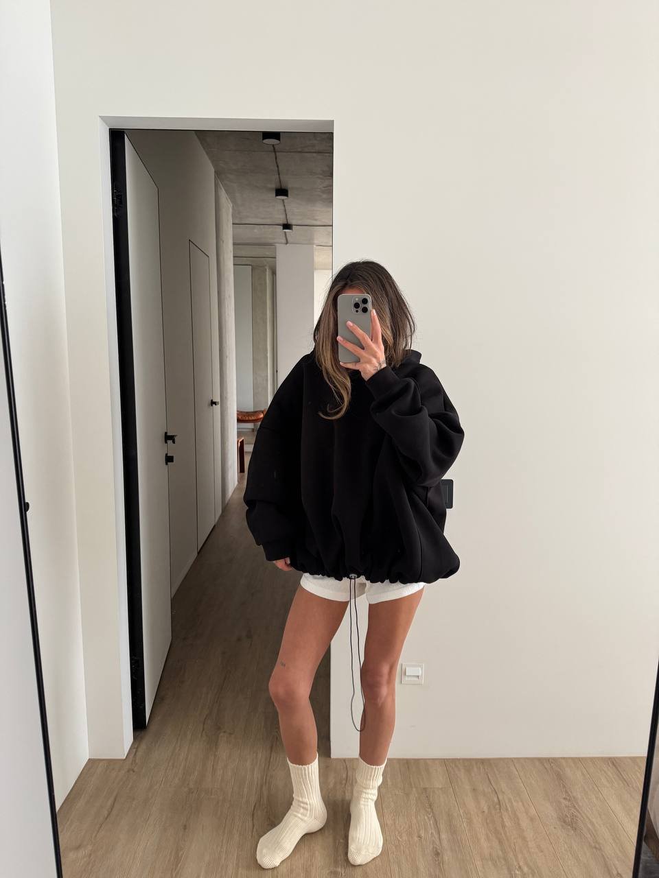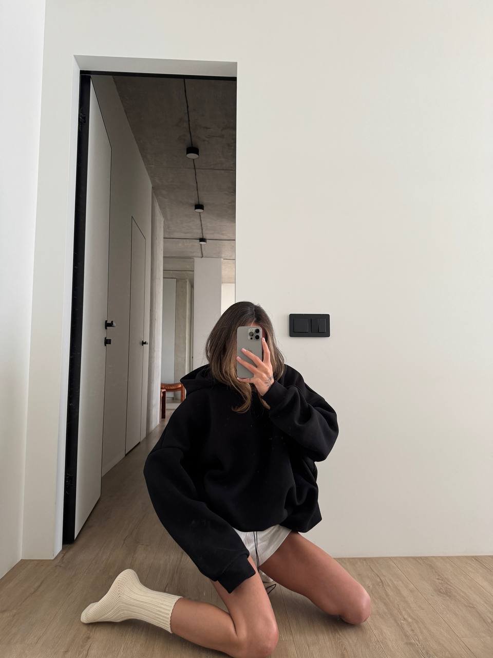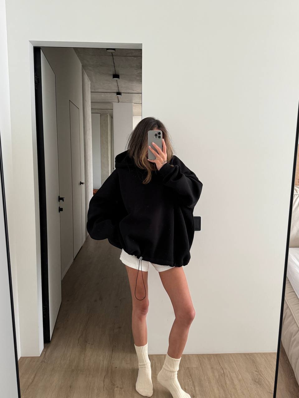 Oversize stiliaus džemperis. 100% medvilnė. Viduje yra švelnus pūkelis. Ilgos rankovės. Apačioje reguliuojasi. Juodos spalvos.