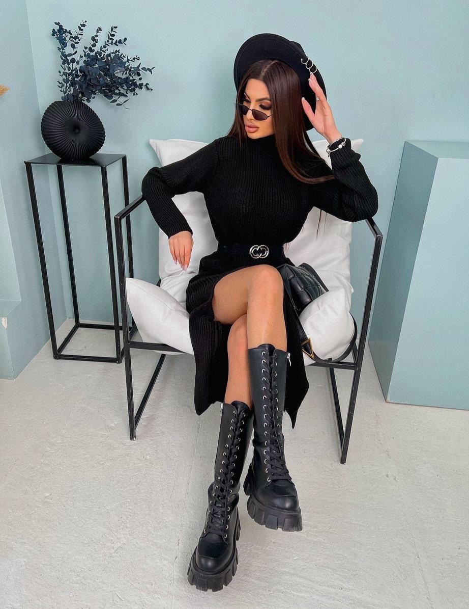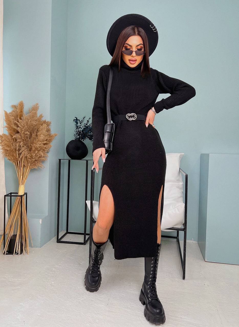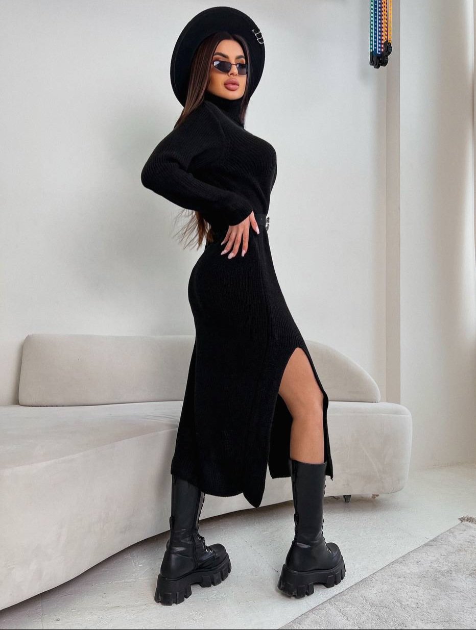 Ilga suknelė. Šonuose yra skeltukai. Storos medžiagos. Aukštas kaklas. Tiesaus kirpimo. Parduodama BE DIRŽELIO. Juoda spalva.