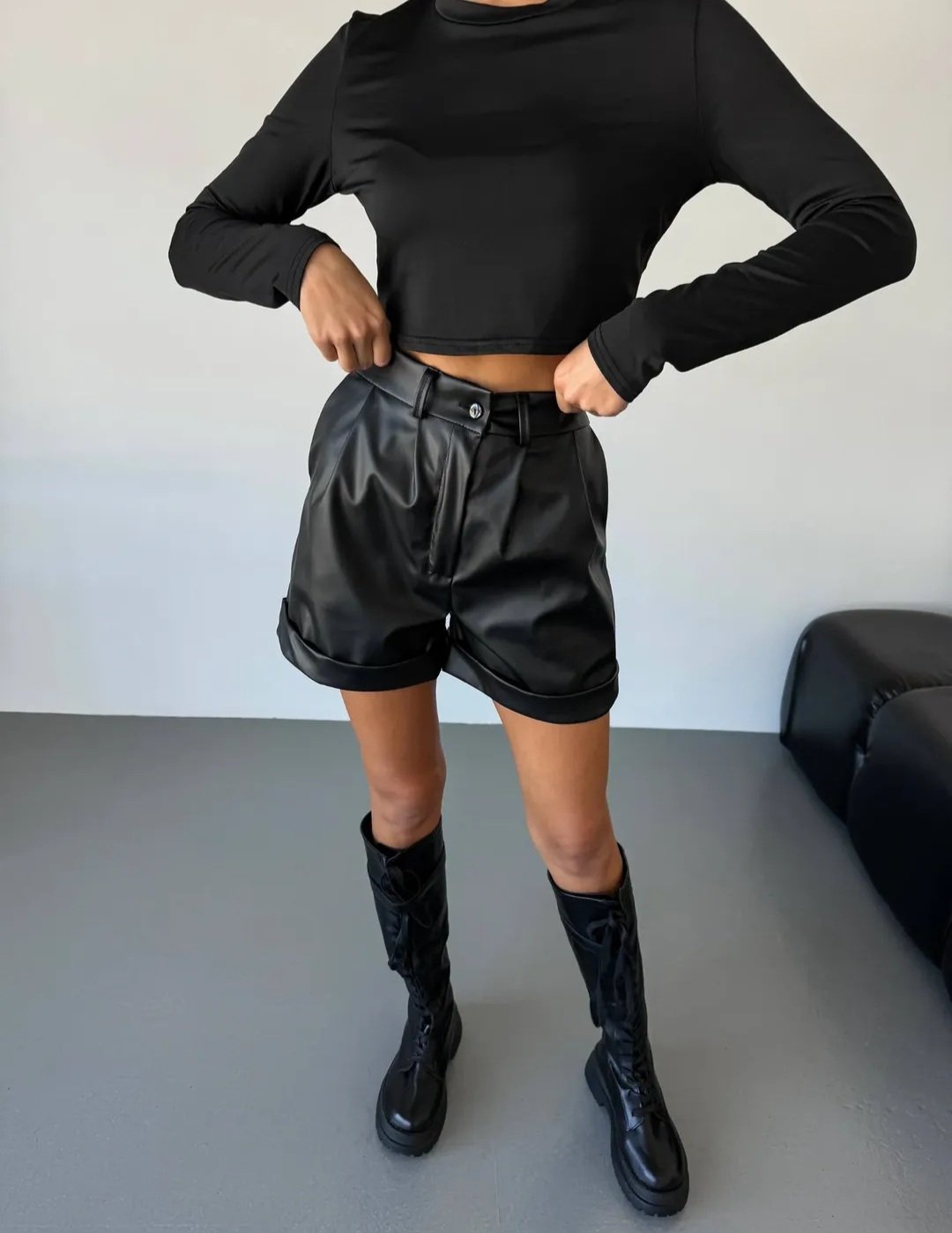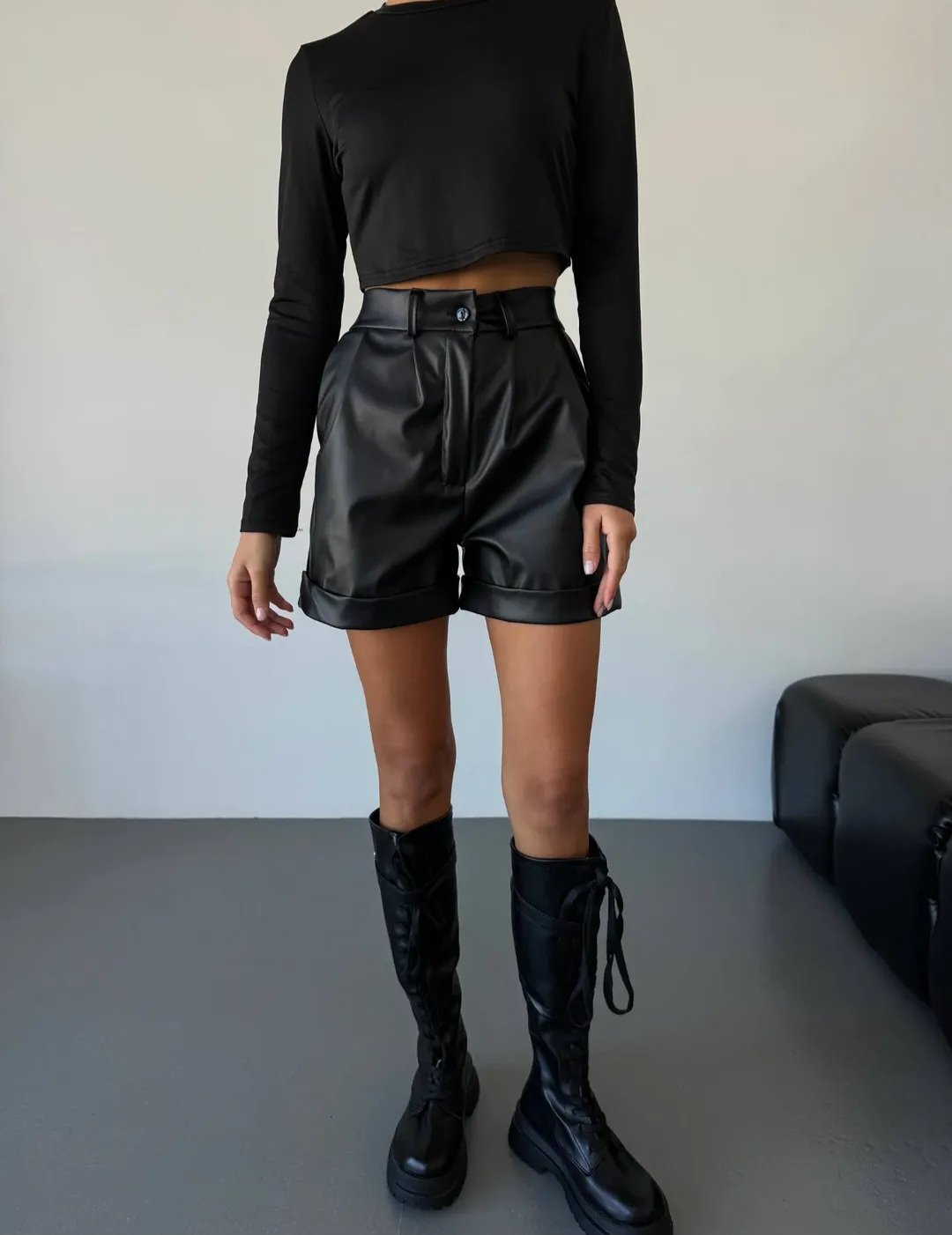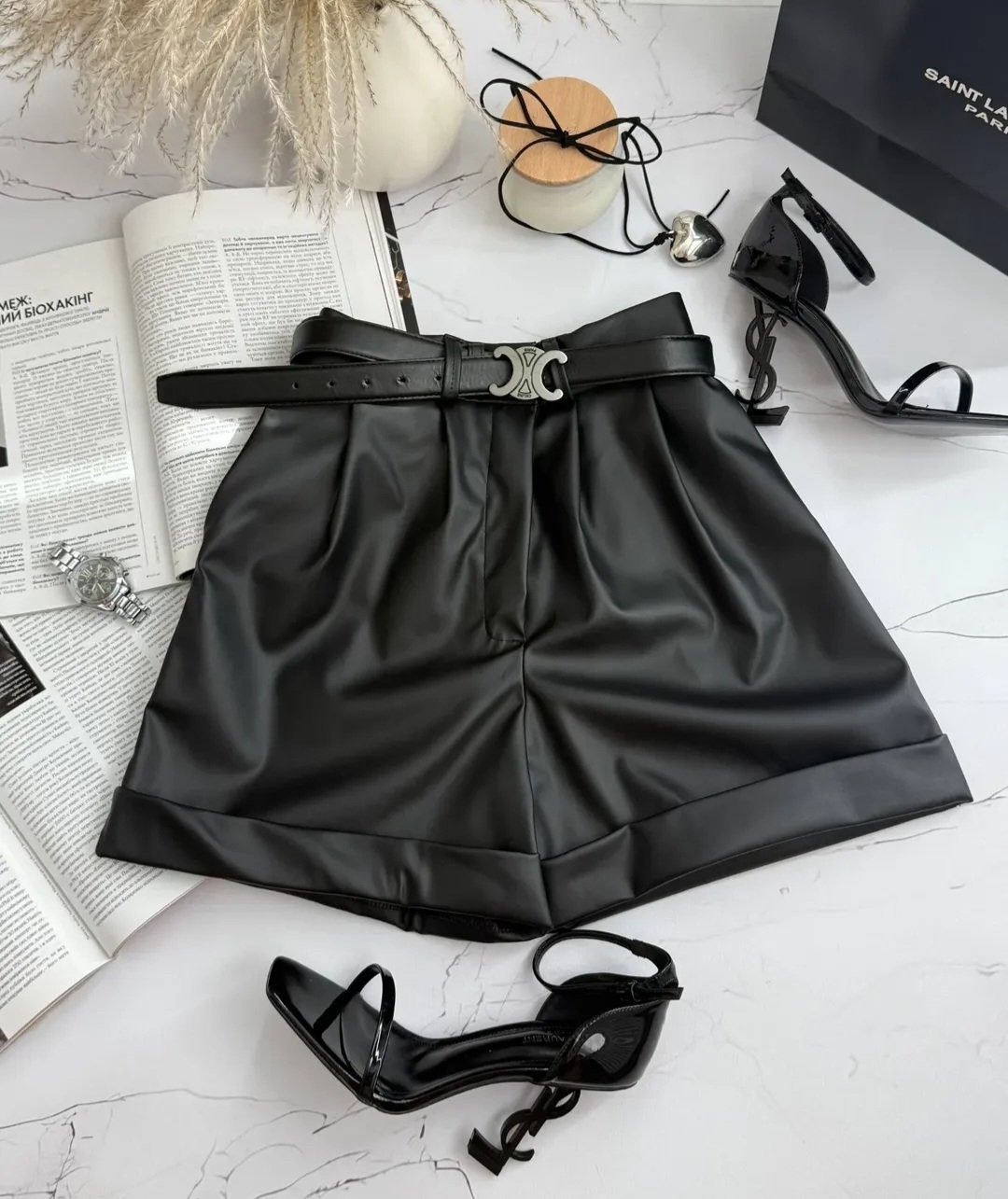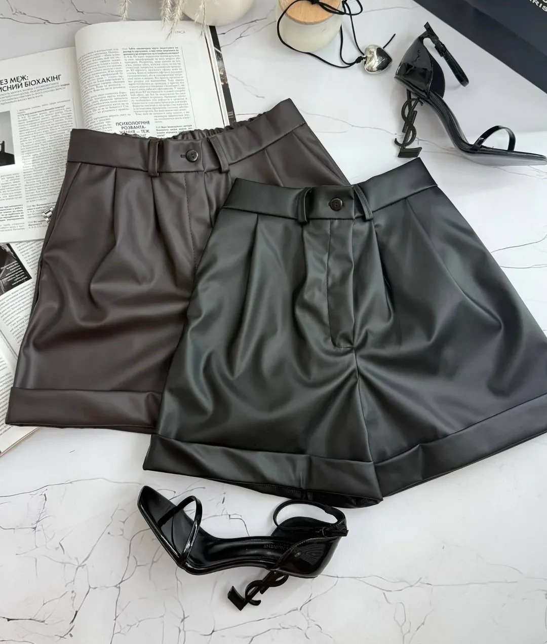 Eco odos šortai. Aukštas liemuo. Užsegami saga ir užtrauktuku. Yra kišenės. Standžios, kokybiškos medžiagos. Turime dviejų spalvų: juodos, tamsiai rudos.