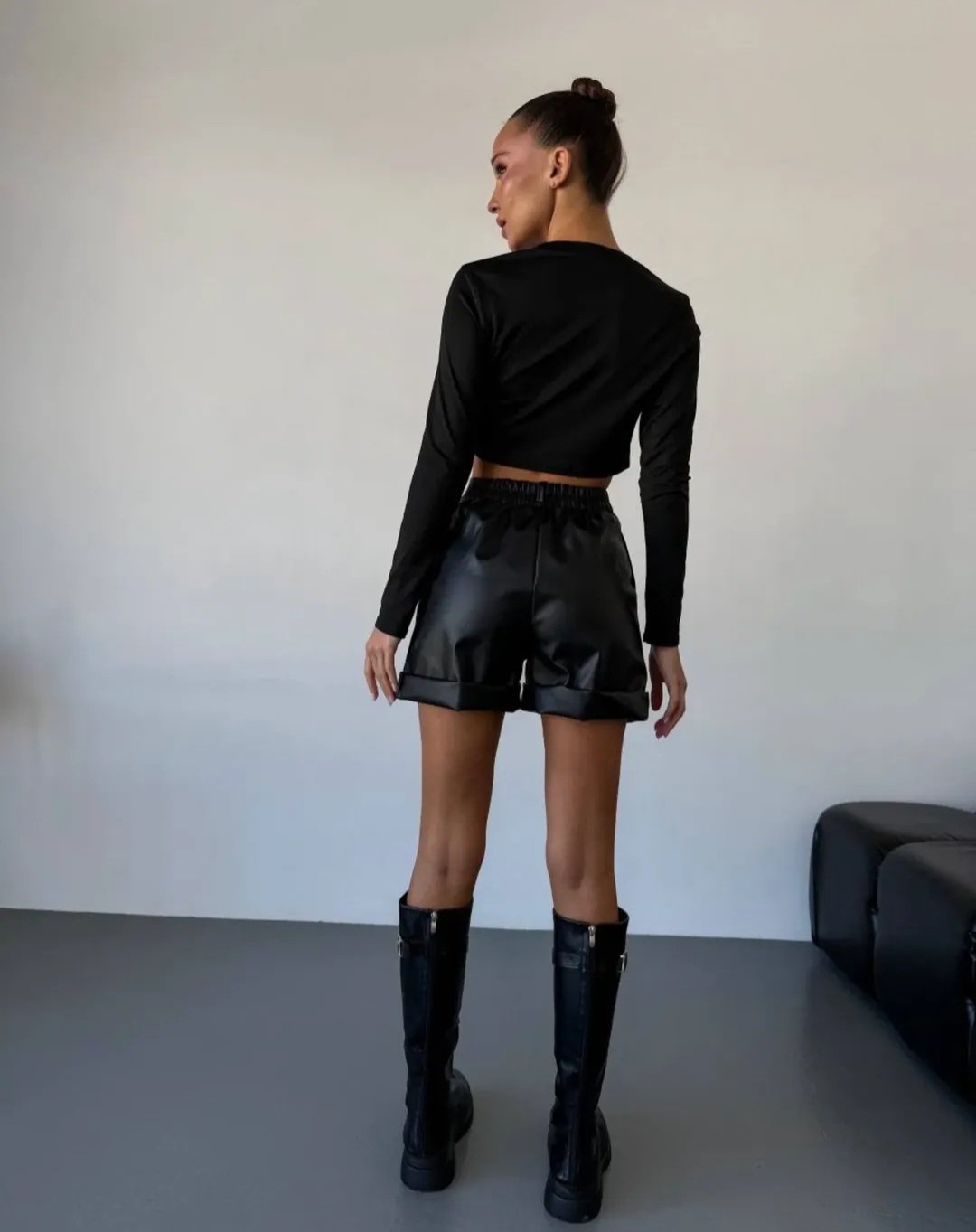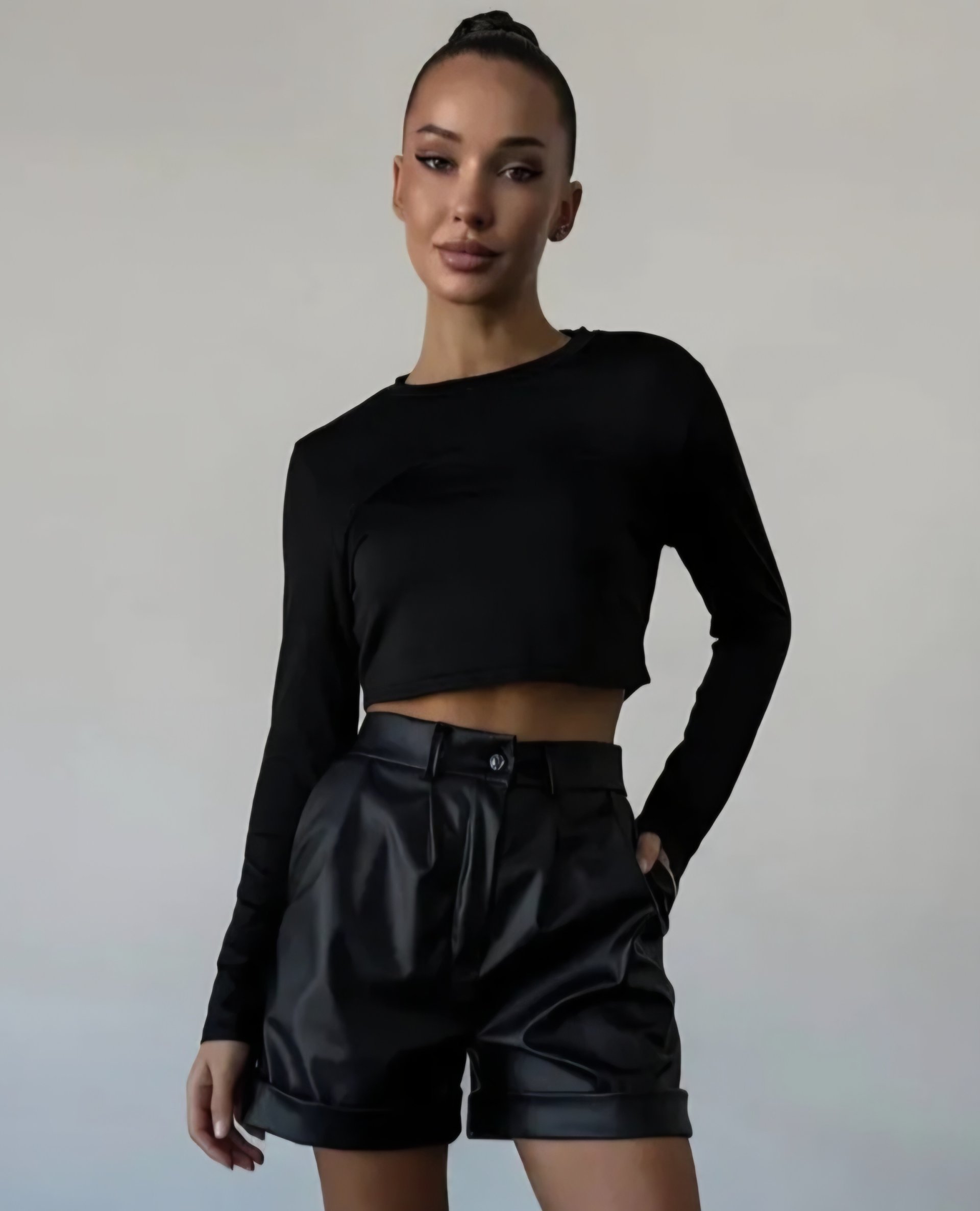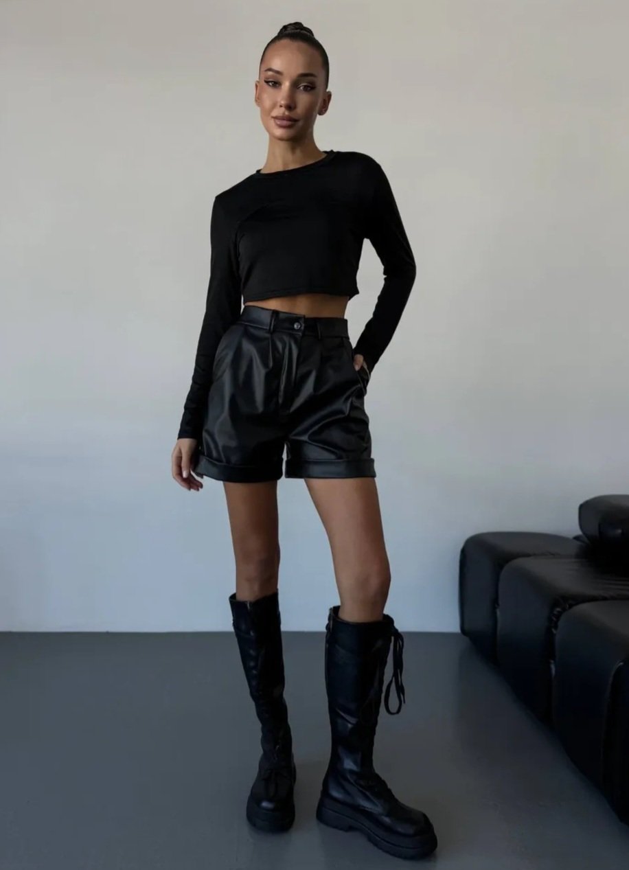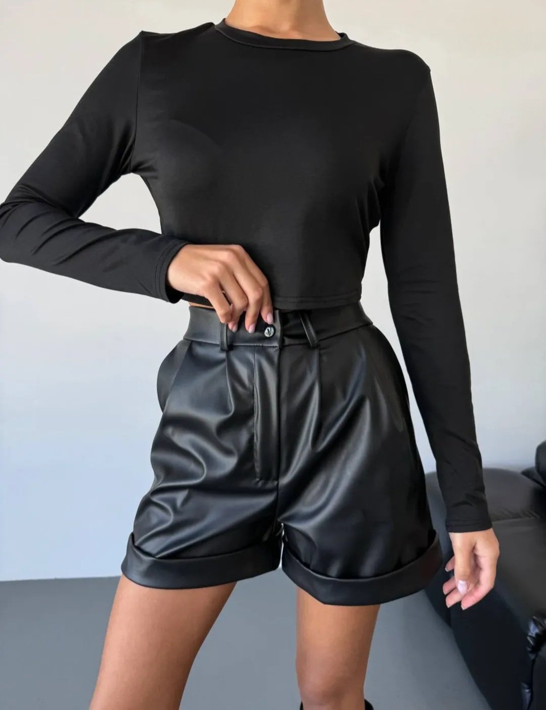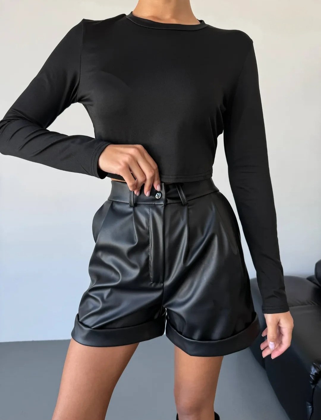 Eco odos šortai. Aukštas liemuo. Užsegami saga ir užtrauktuku. Yra kišenės. Standžios, kokybiškos medžiagos. Turime dviejų spalvų: juodos, tamsiai rudos.