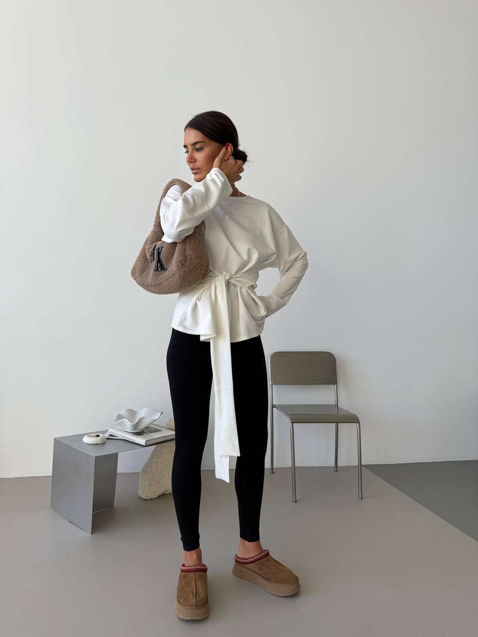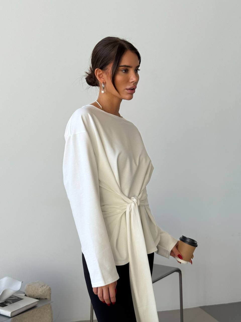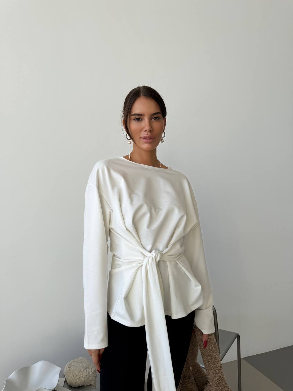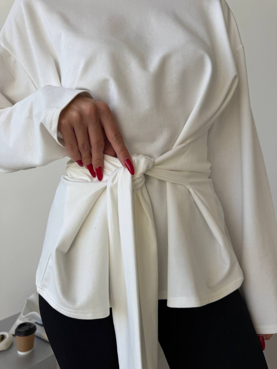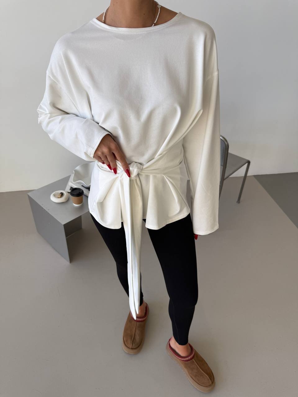 Baltos spalvos palaidinė. 70% medvilnė, 30% poliesteris. Ilgos rankovės. Priekyje surišama.