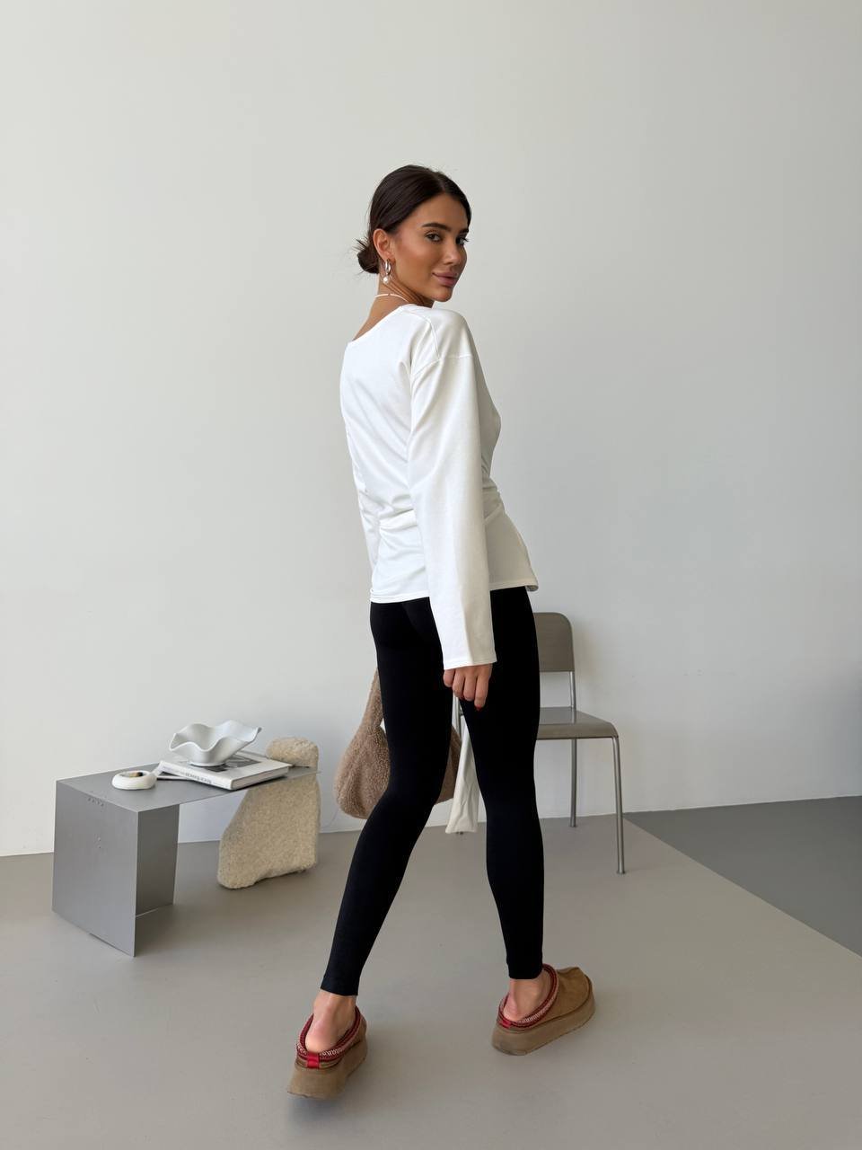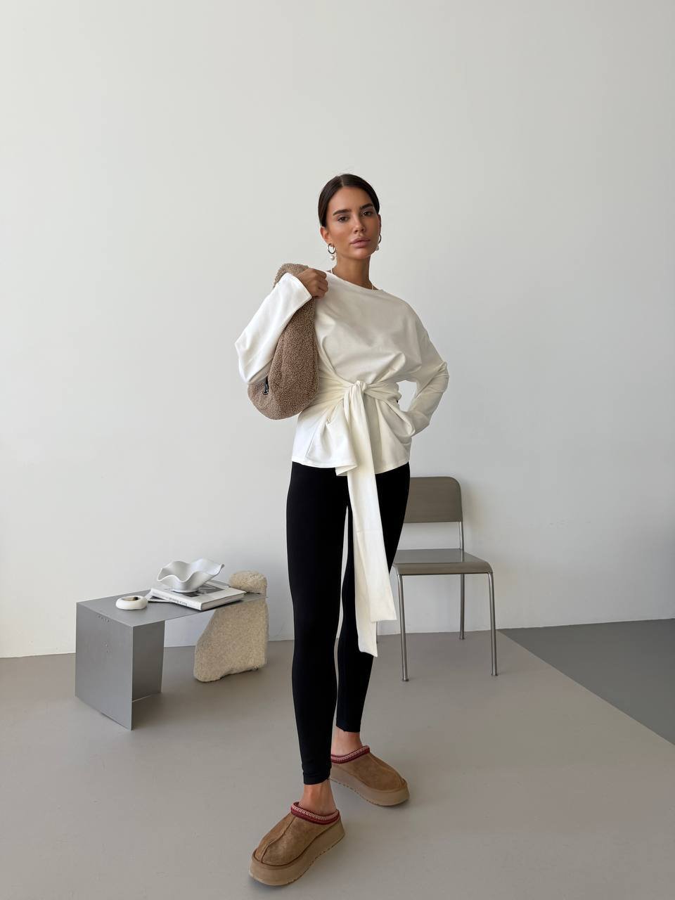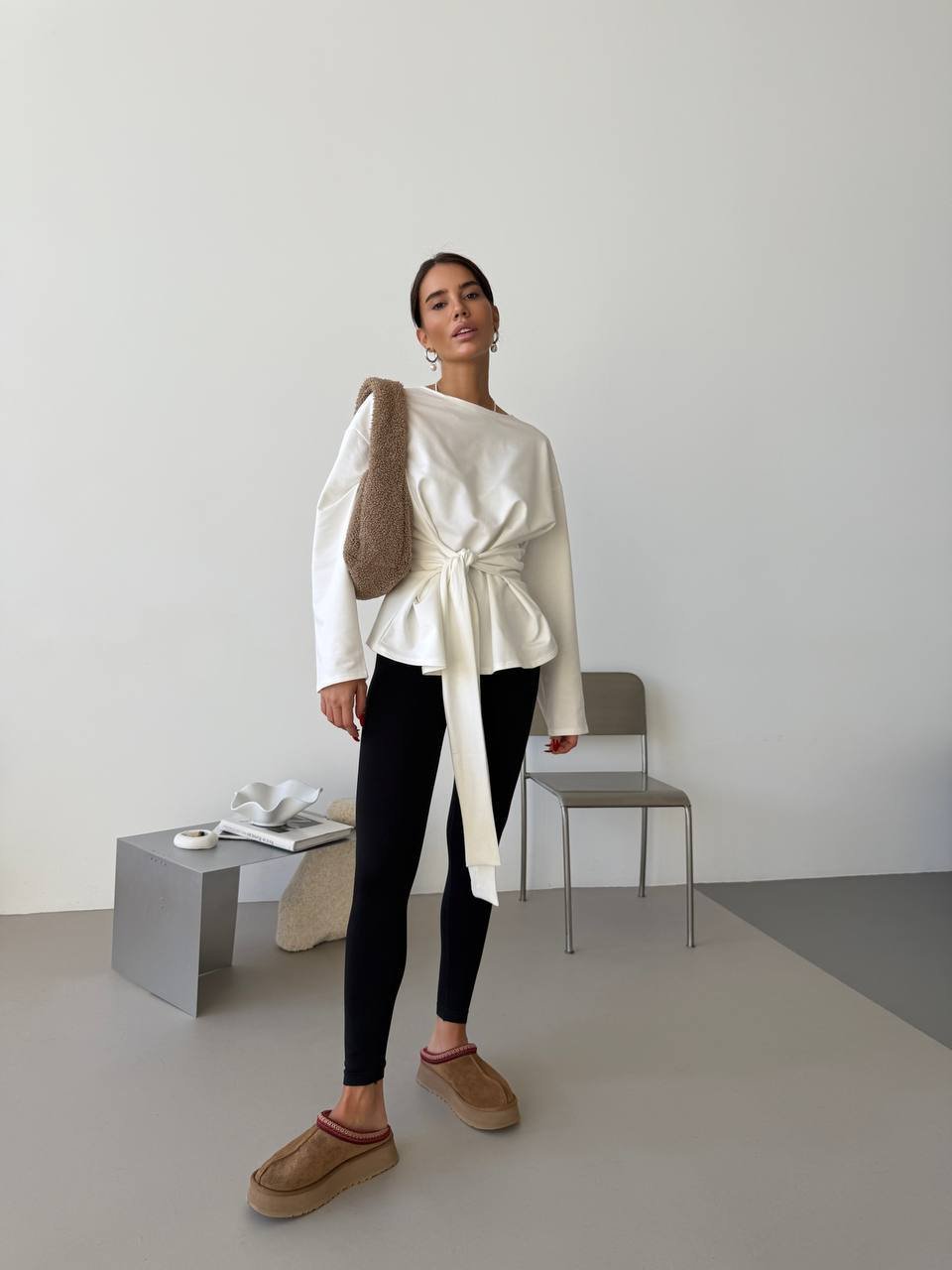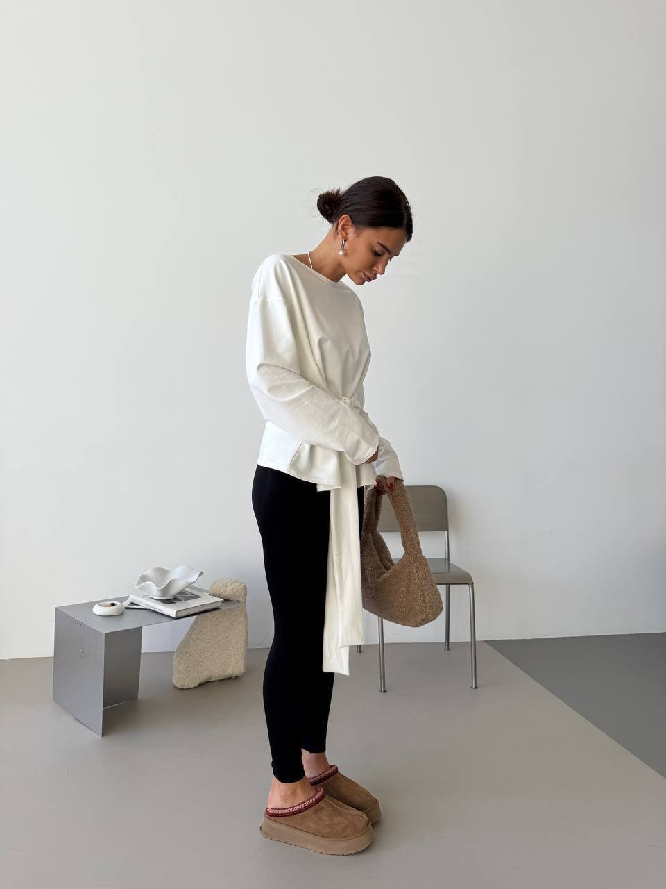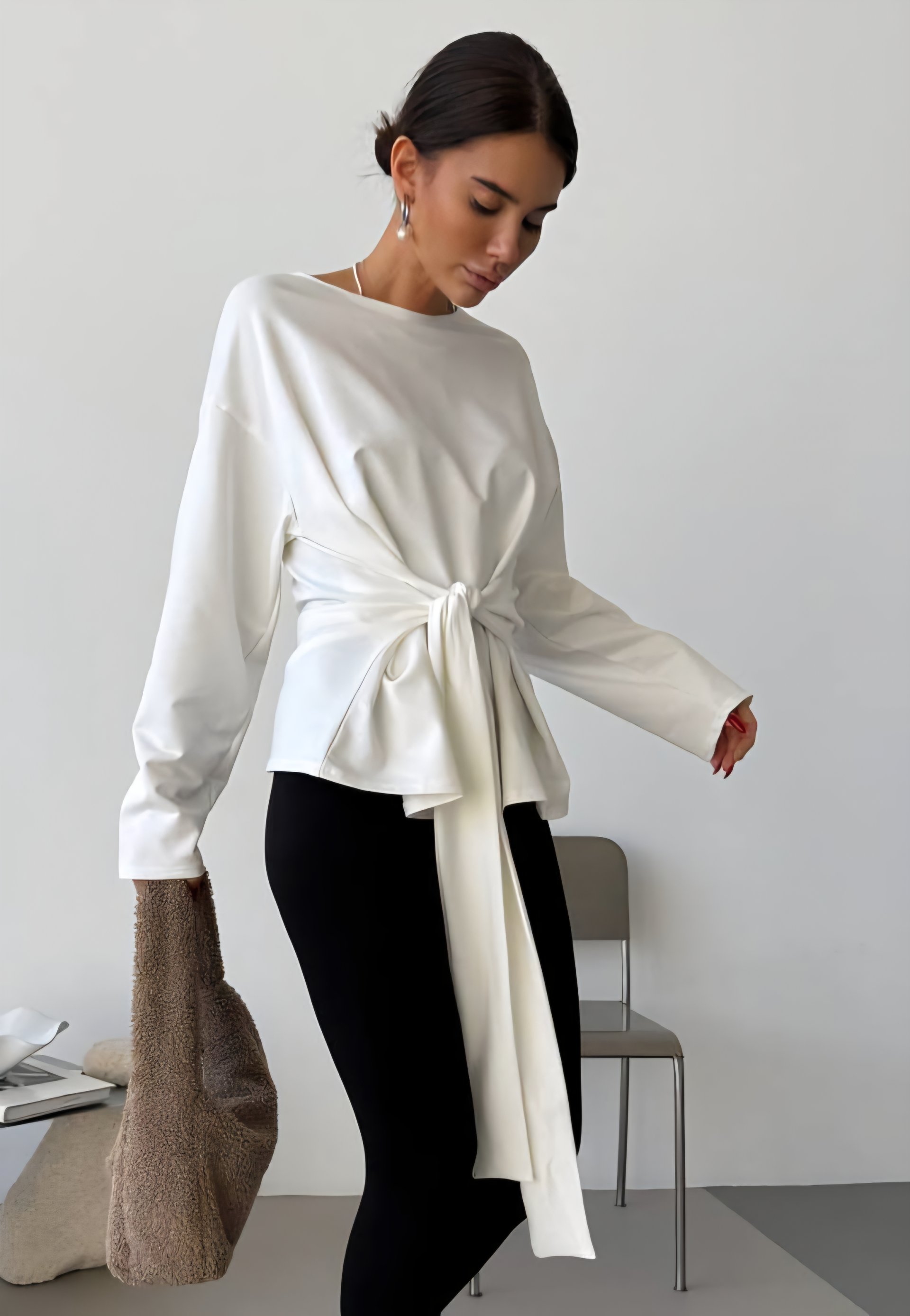 Baltos spalvos palaidinė. 70% medvilnė, 30% poliesteris. Ilgos rankovės. Priekyje surišama.