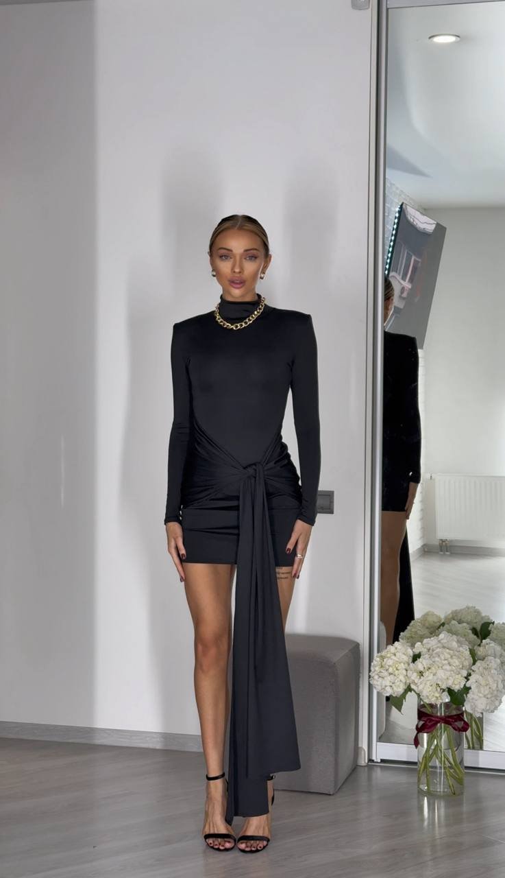Puošni išskirtinio dizaino suknelė. Ilgos rankovės. Tamprios medžiagos. Raudonos spalvos. Ties liemeniu surišama. Aukštu kaklu. Turime trijų skirtingų spalvų.