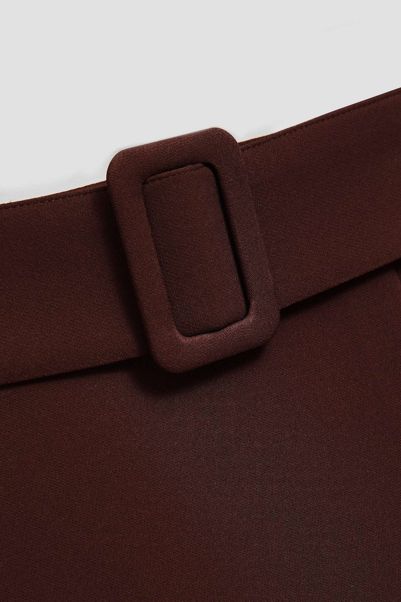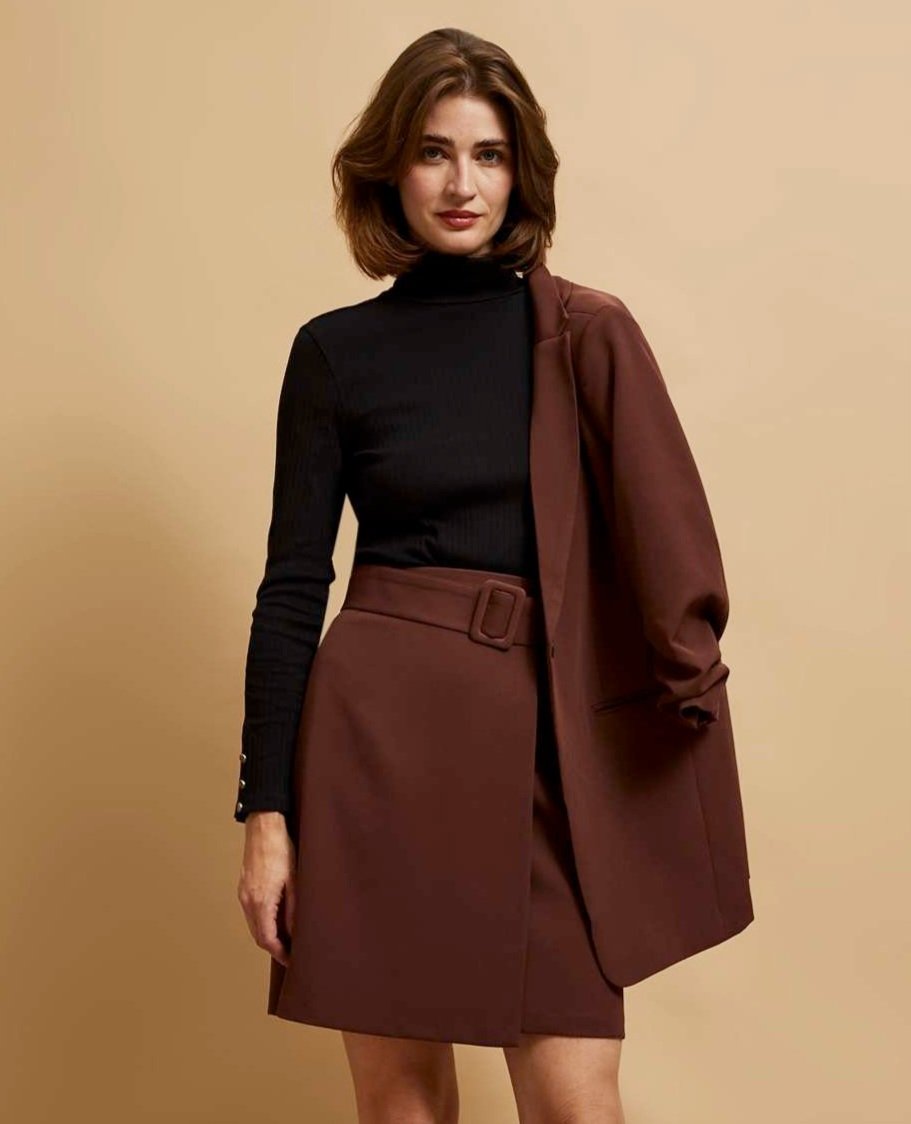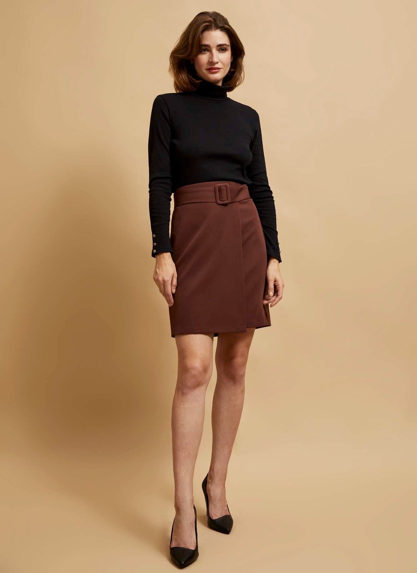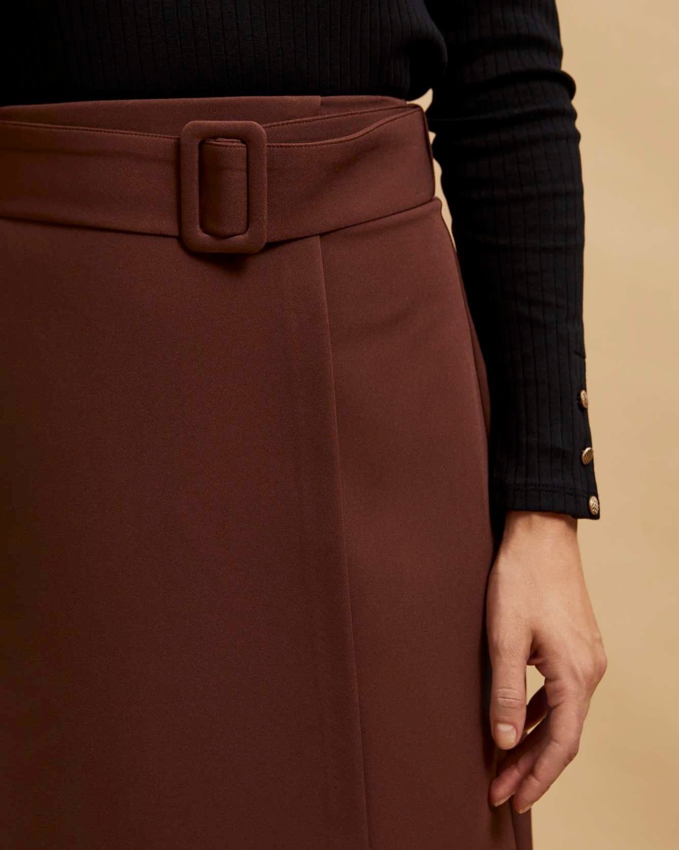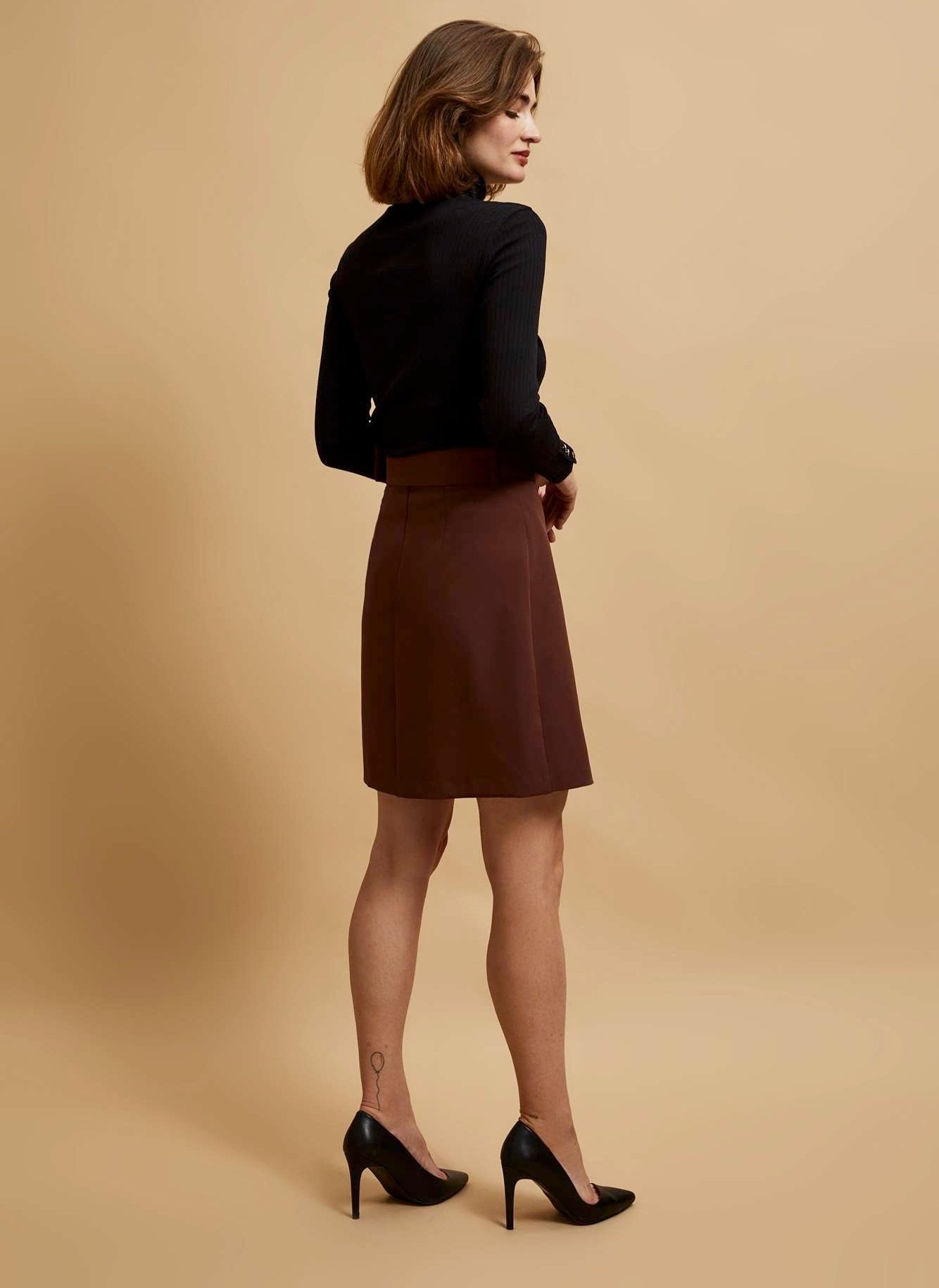 Klasikinio stiliaus sijonas. Aukštas liemuo. Per liemenį rišasi diržas. Rudos spalvos. Poliesteris.