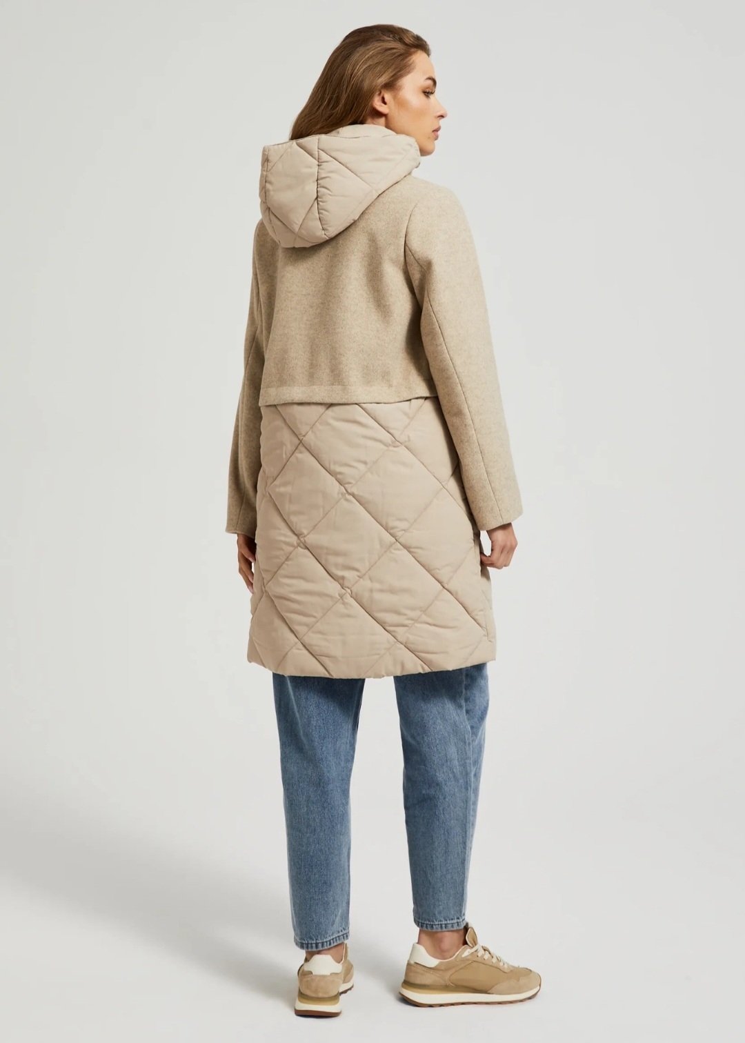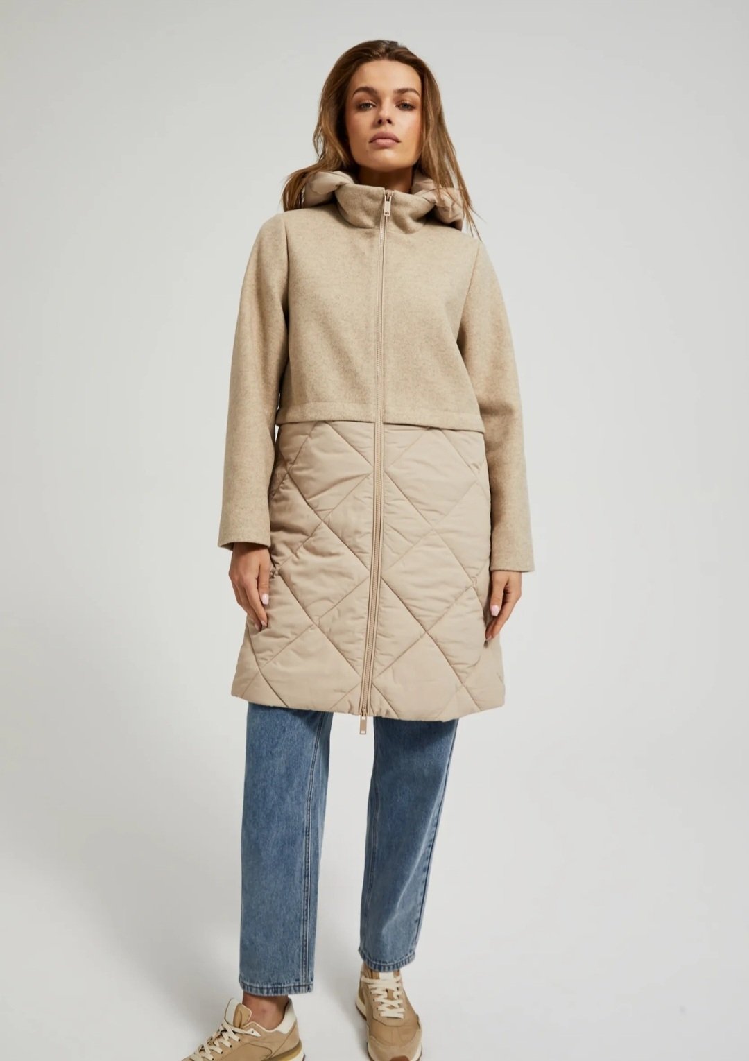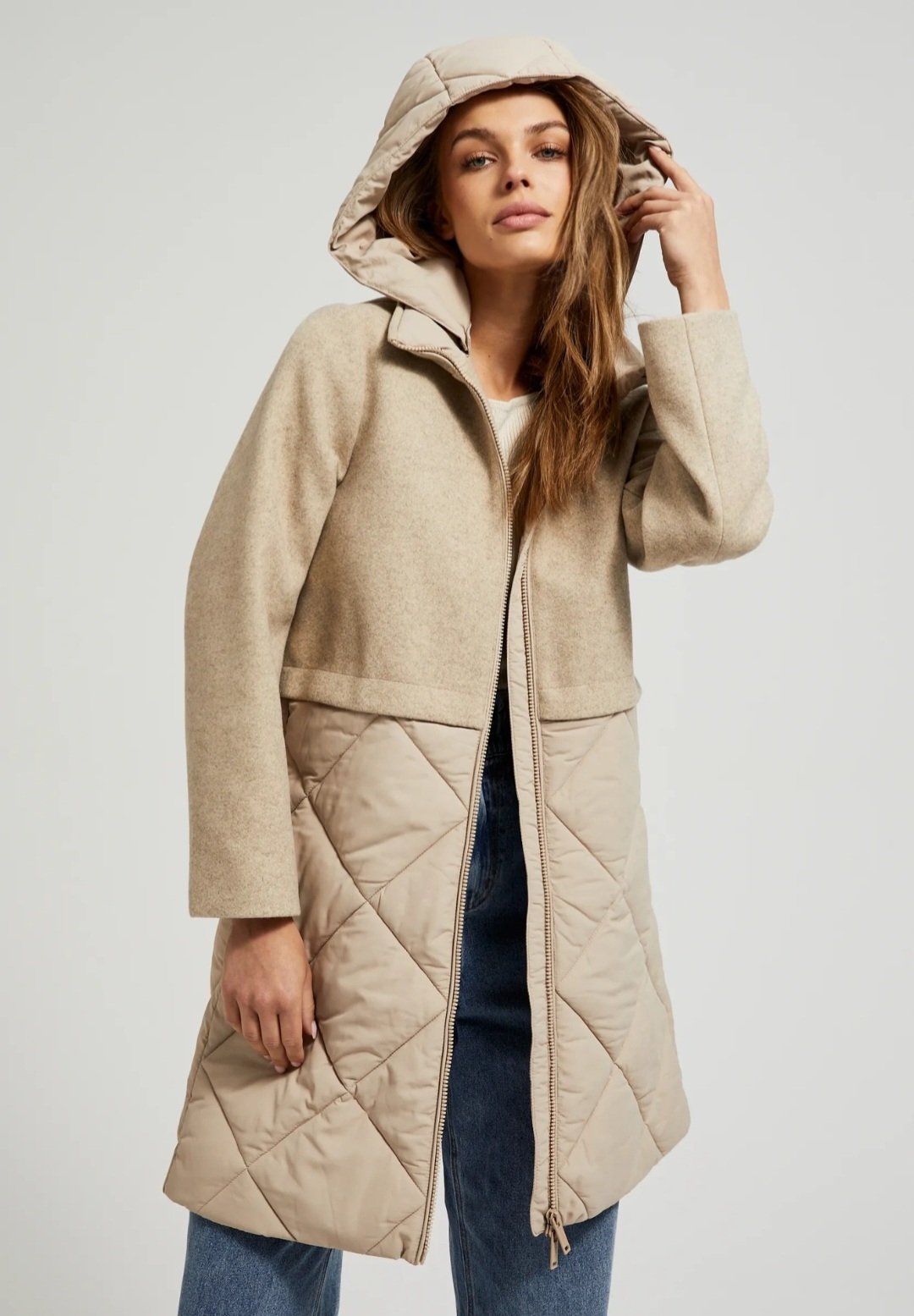 Išskirtinio dizaino striukė. Ilgos rankovės. Yra kišenės ir gobtuvas. Gobtuvas nusiima. Kreminės spalvos. Poliesteris.
