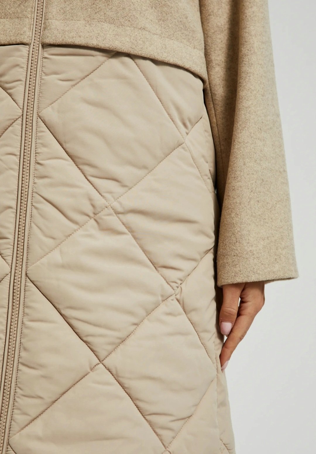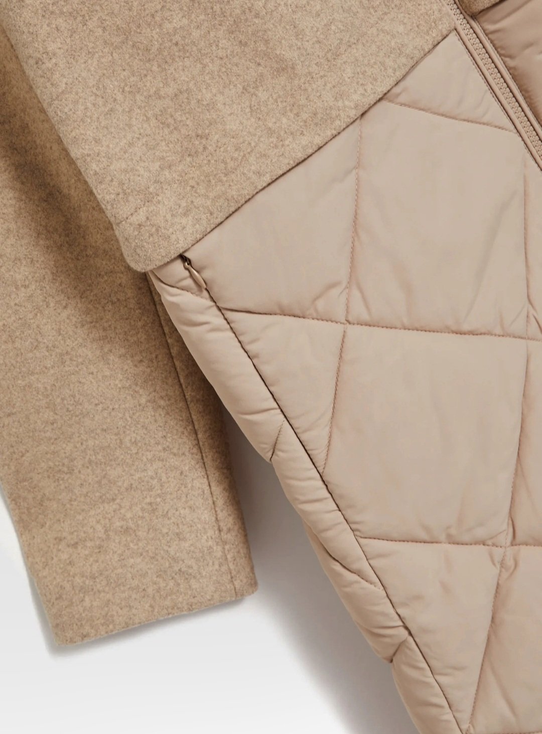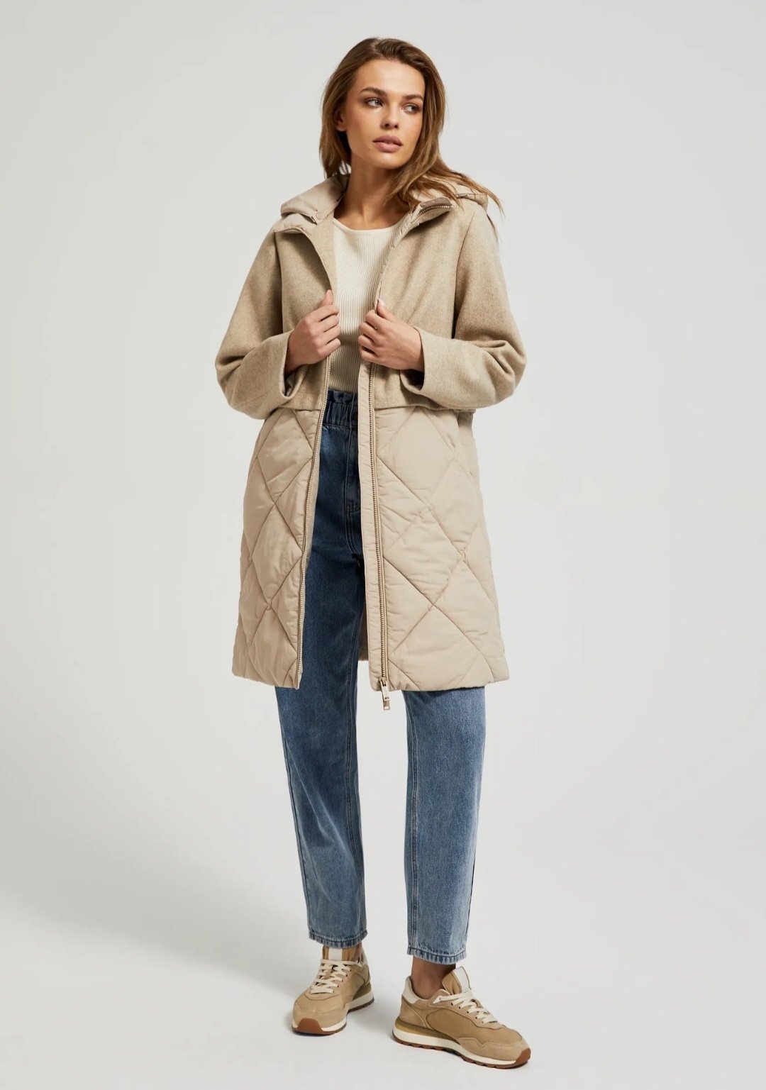 Išskirtinio dizaino striukė. Ilgos rankovės. Yra kišenės ir gobtuvas. Gobtuvas nusiima. Kreminės spalvos. Poliesteris.