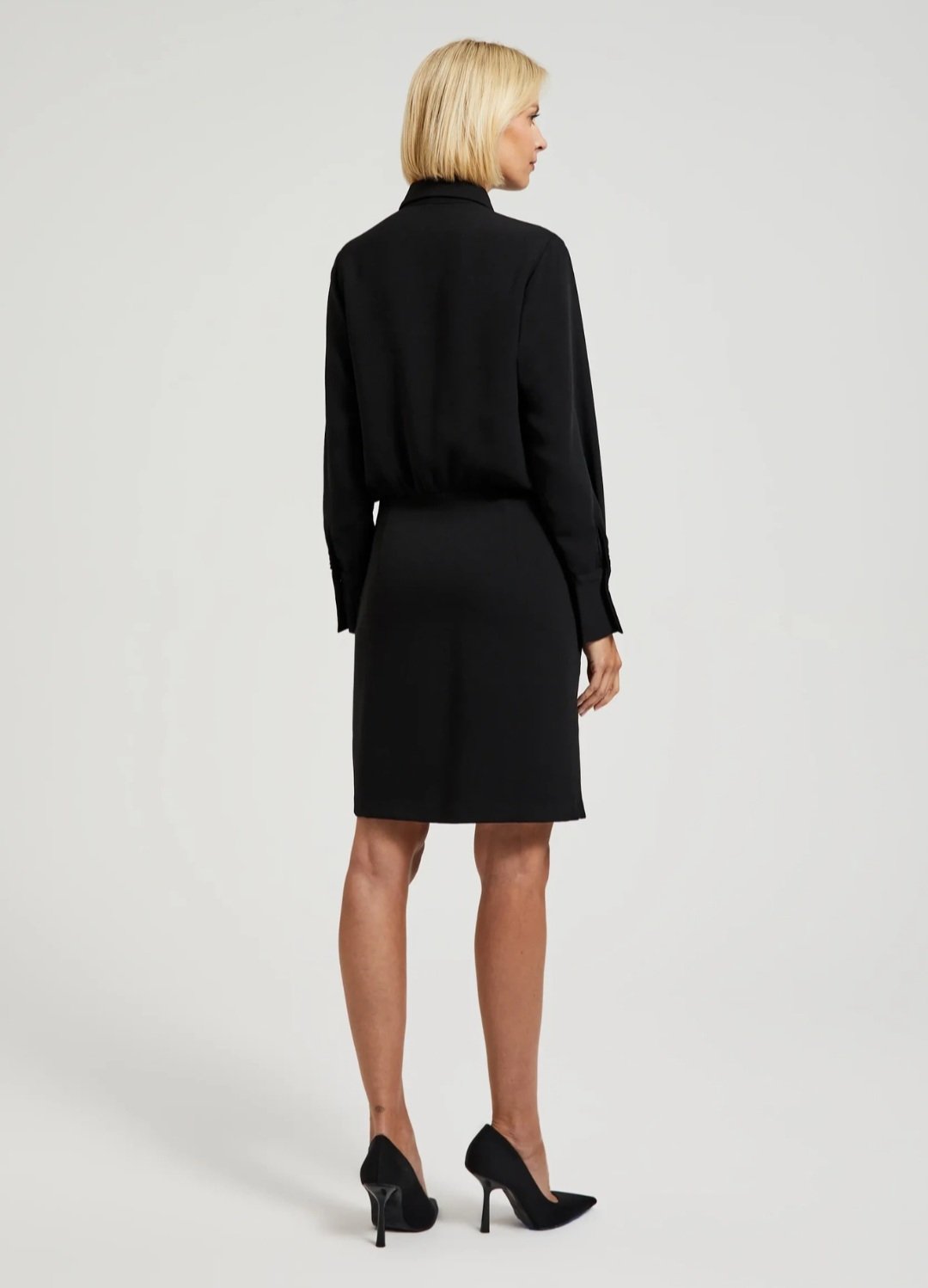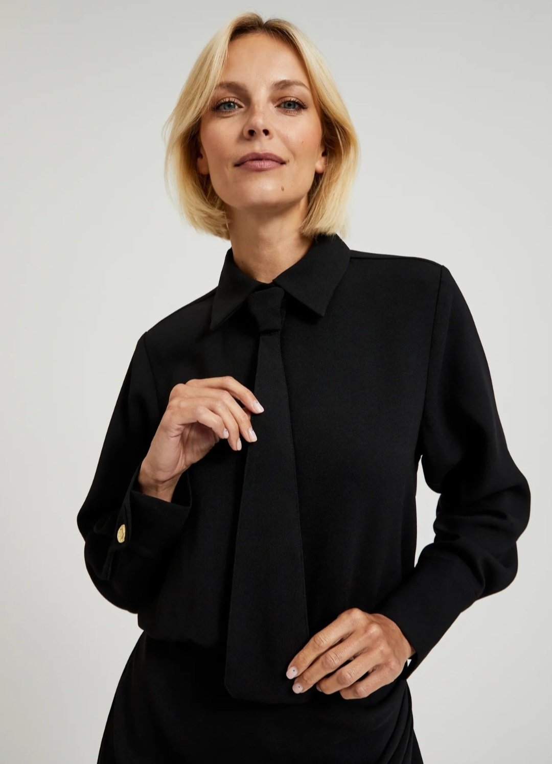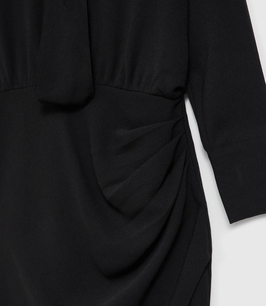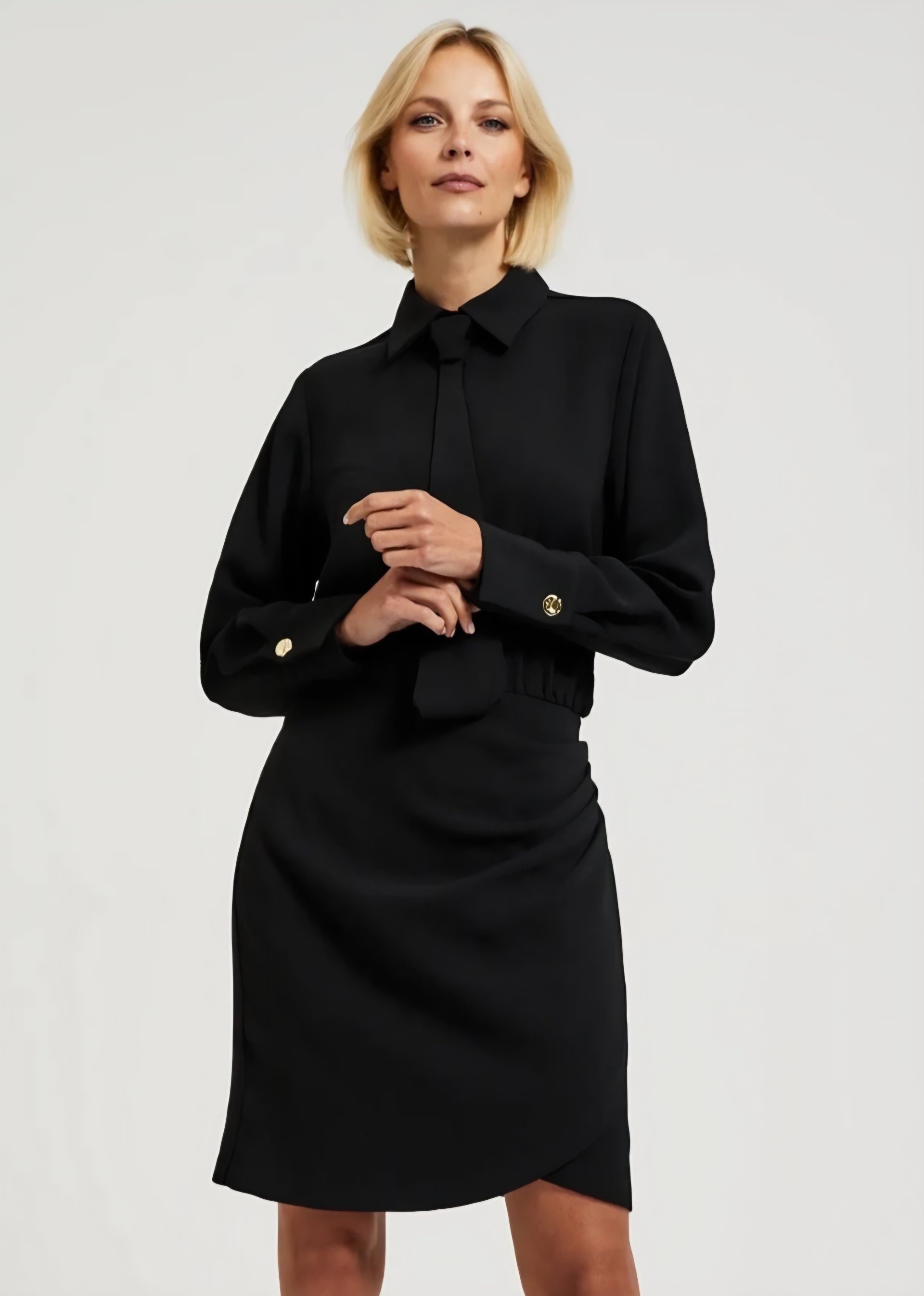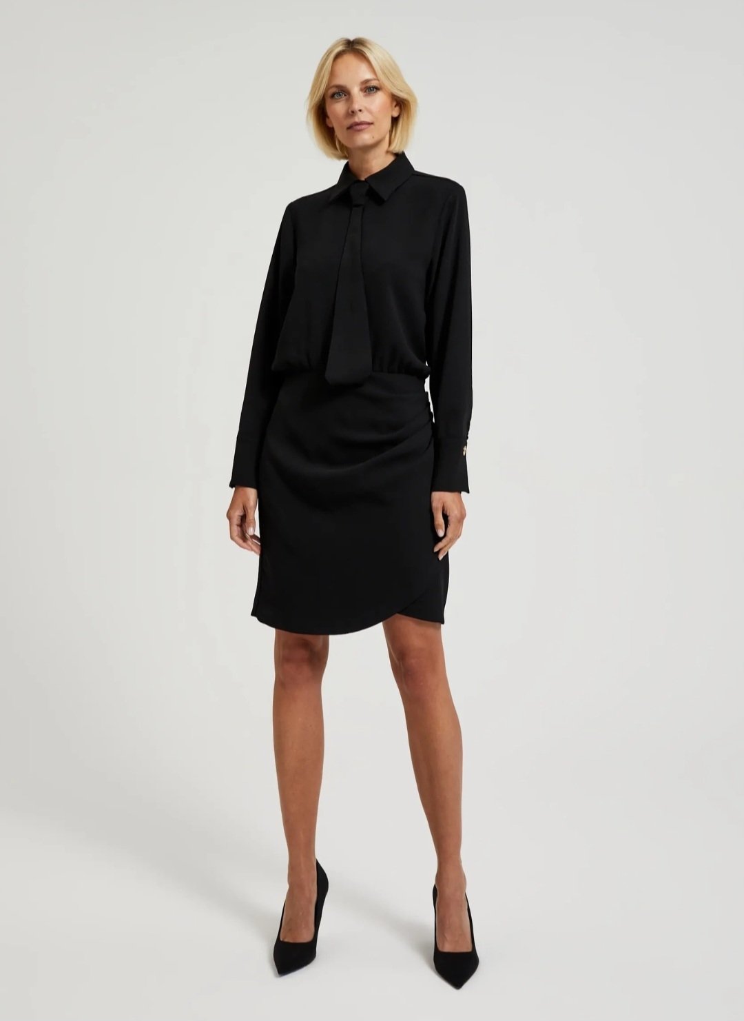 Juoda, klasikinė suknelė. Suknelė su kaklaraiščiu. Jis nusiima, galite dėvėti ir be jo. Poliesteris.