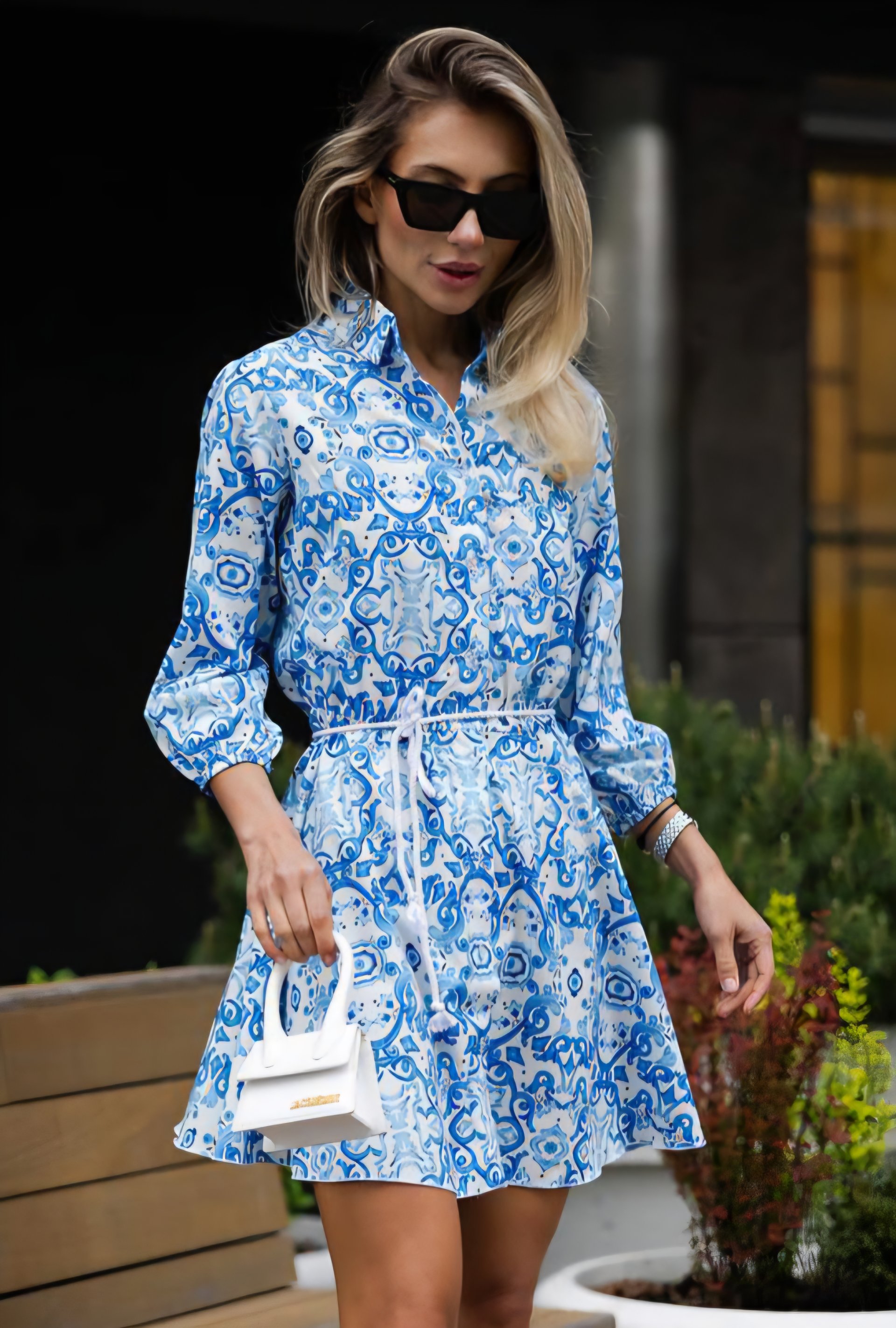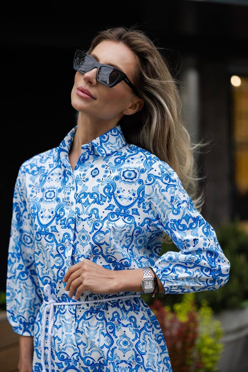 Suknelė su dirželiu. Per visą ilgį užsegama sagomis. Per liemenį rišasi dirželis, tačiau galite dėvėti ir be jo. Malonios medžiagos. Poliesteris.