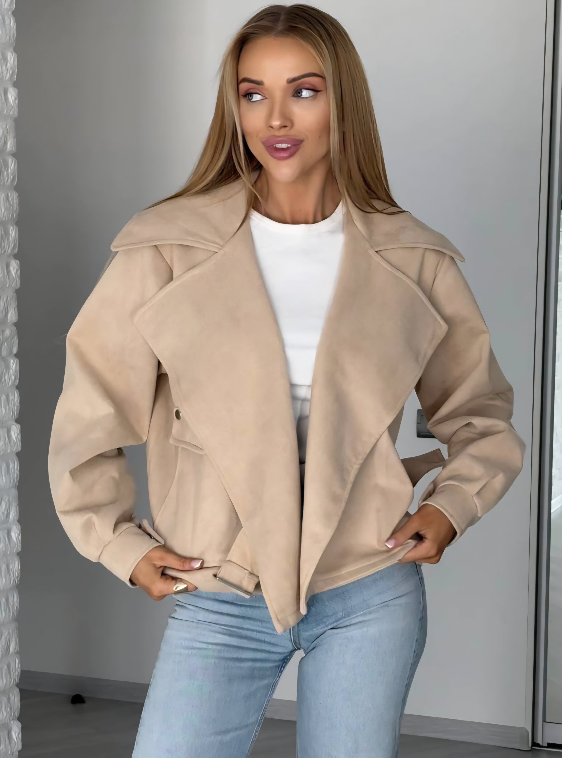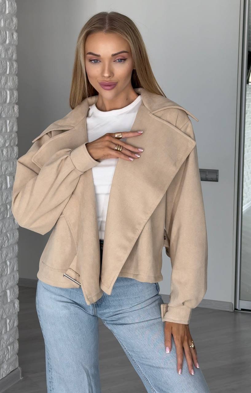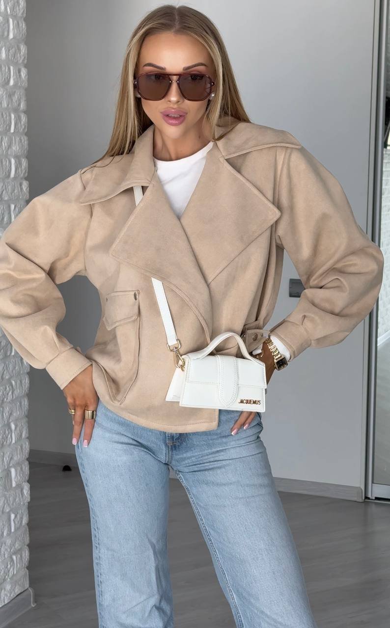 Kreminės spalvos švarkas. Ilgos, platesnio modelio rankovės. Užsegamas šone. Kreminės spalvos.