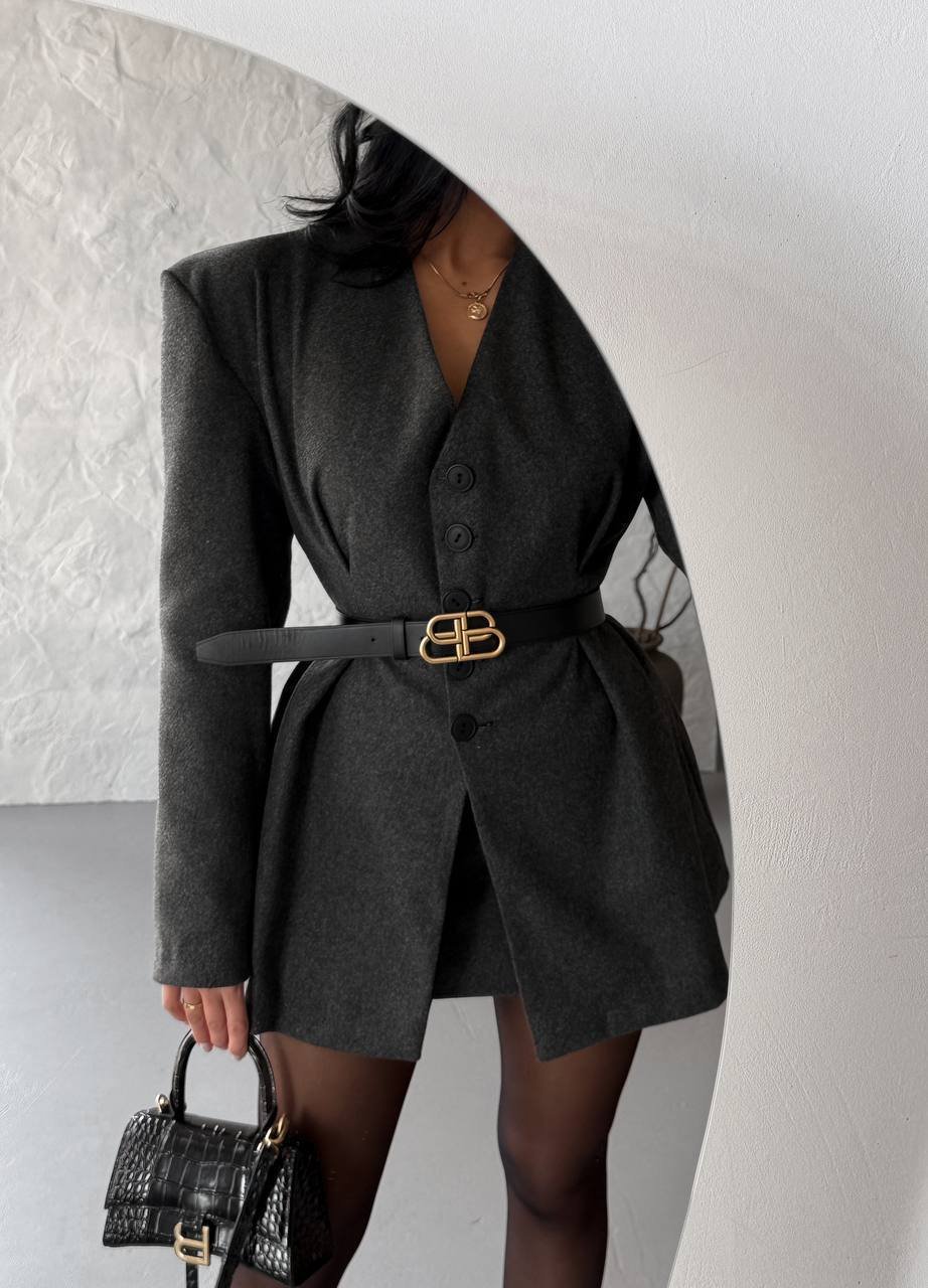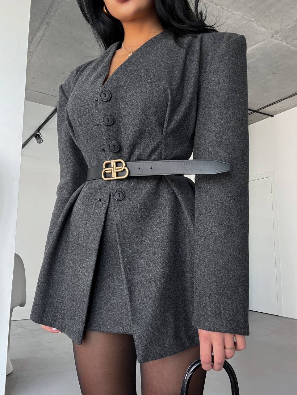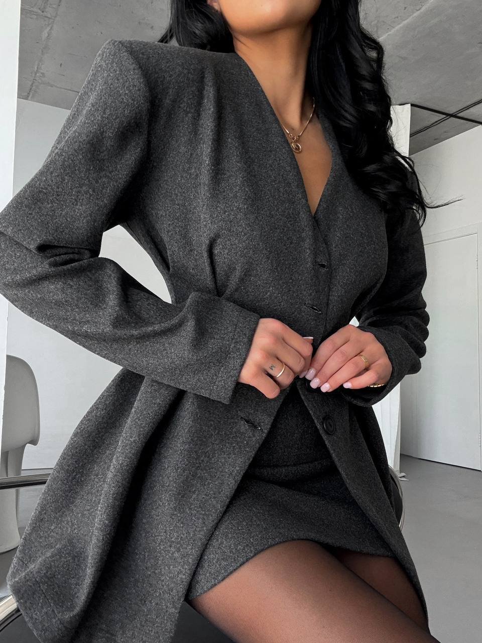 Dviejų dalių kostiumėlis. Švarkas iliemenuotas. Užsegamas sagomis. V formos iškirptė. Pečiai su pakietinimais. Sijonas užsegamas užtrauktuku. Švelnios, šiltos medžiagos.