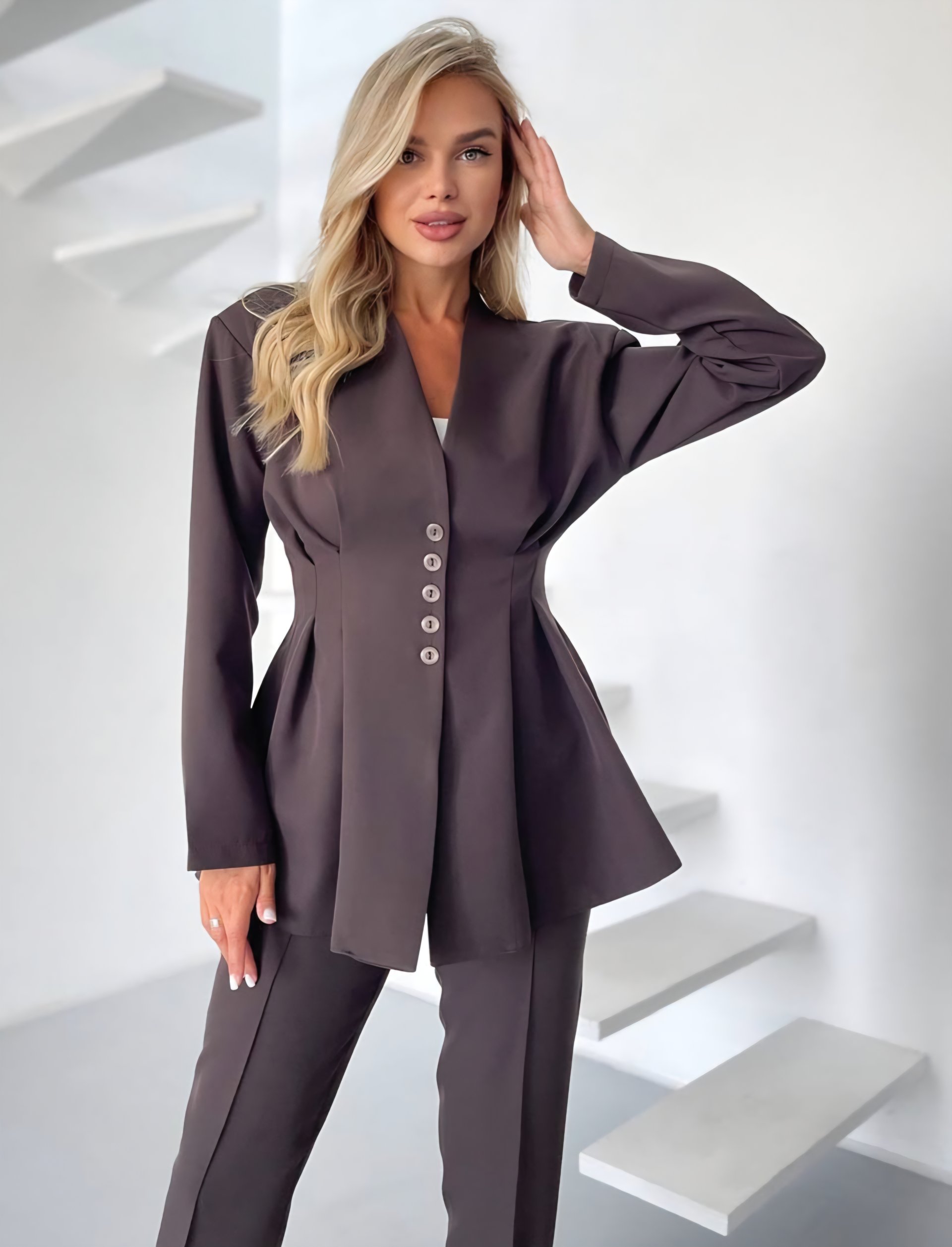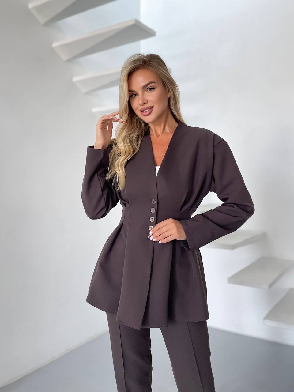 Dviejų dalių kostiumėlis: švarkas ir kelnės. Kelnės aukšto liemens, liemuo su guma. Švarkas užsegamas sagomis. Pečiai su pakietinimais. Turime dviejų spalvų: rudos, juodos.