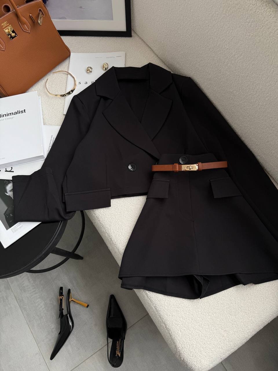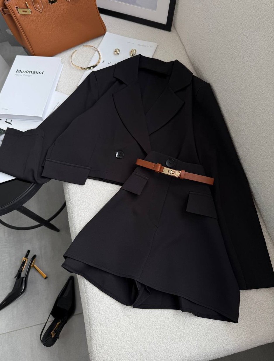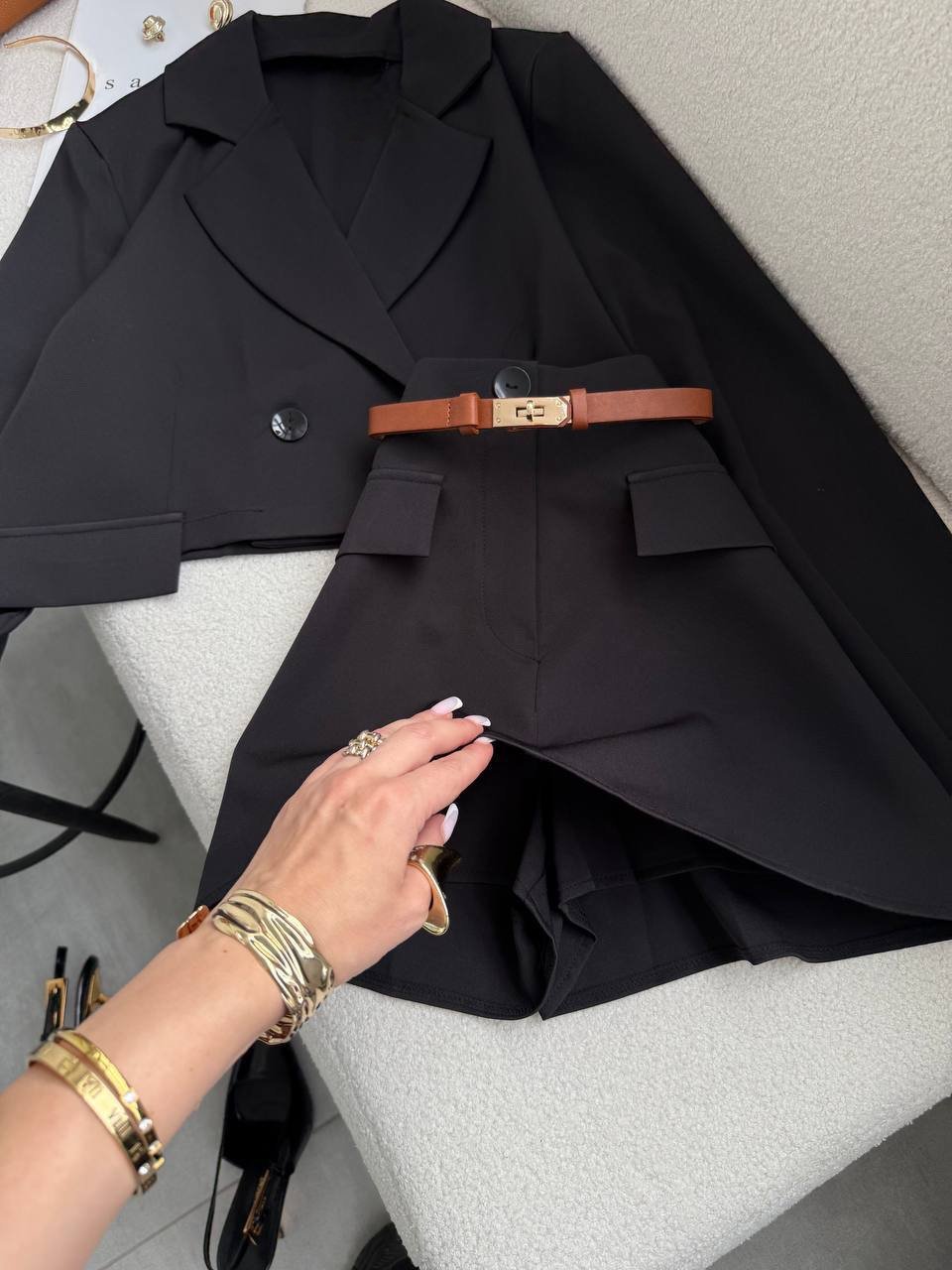 Dviejų dalių kostiumėlis. Trumpesnio modelio švarkelis. Aukšto liemens sijonas/šortai. Poliesteris.