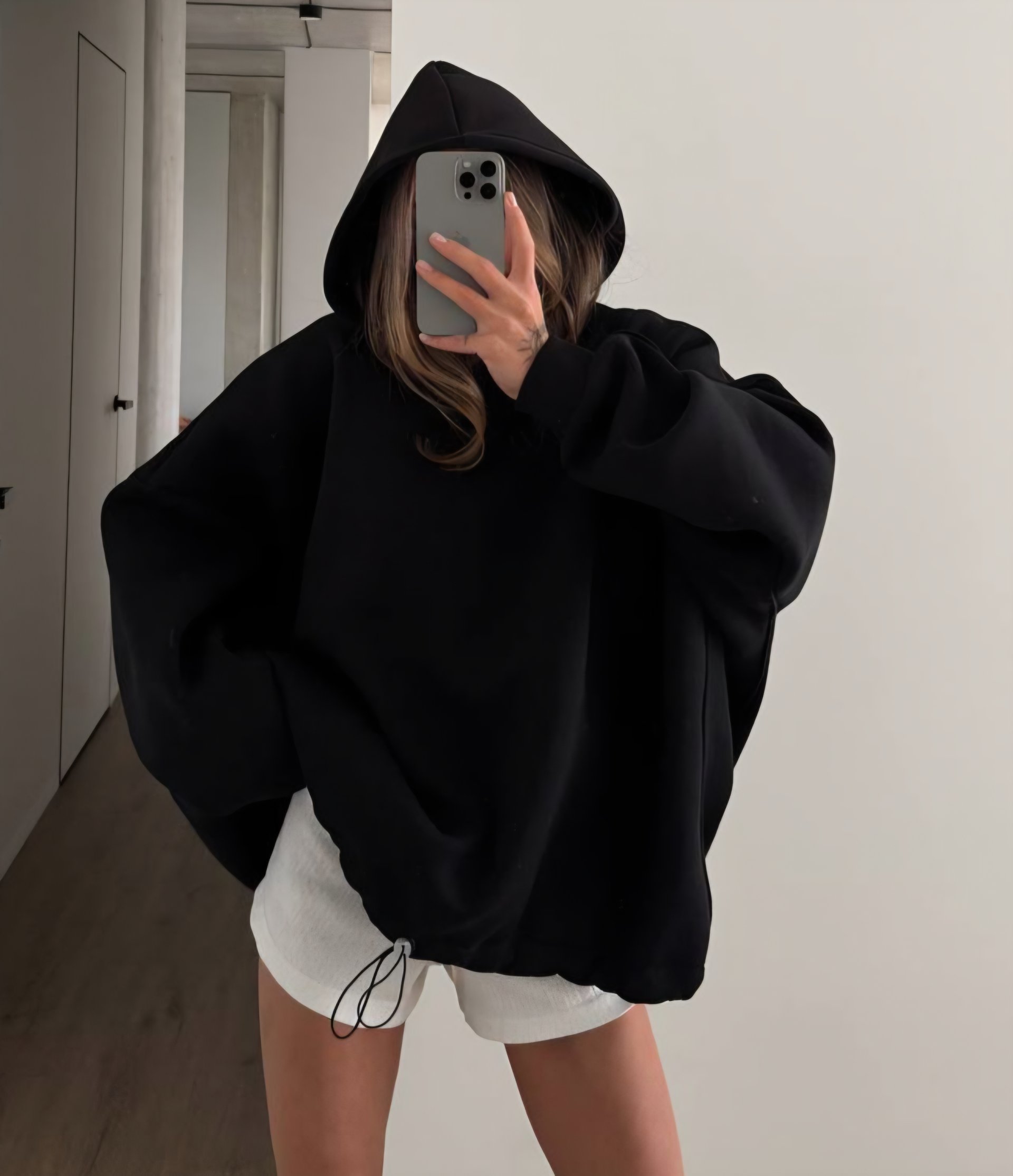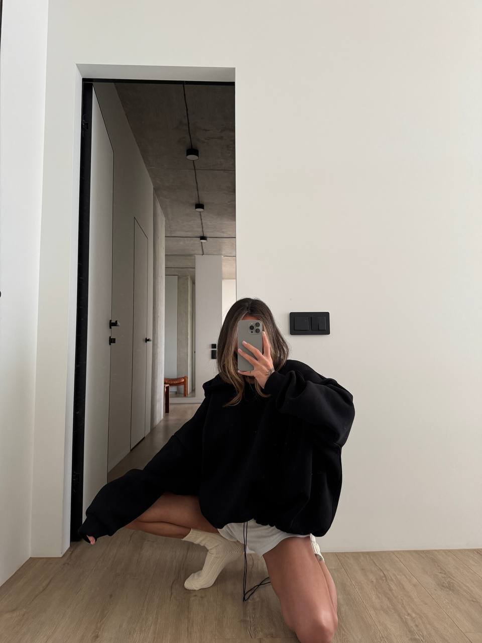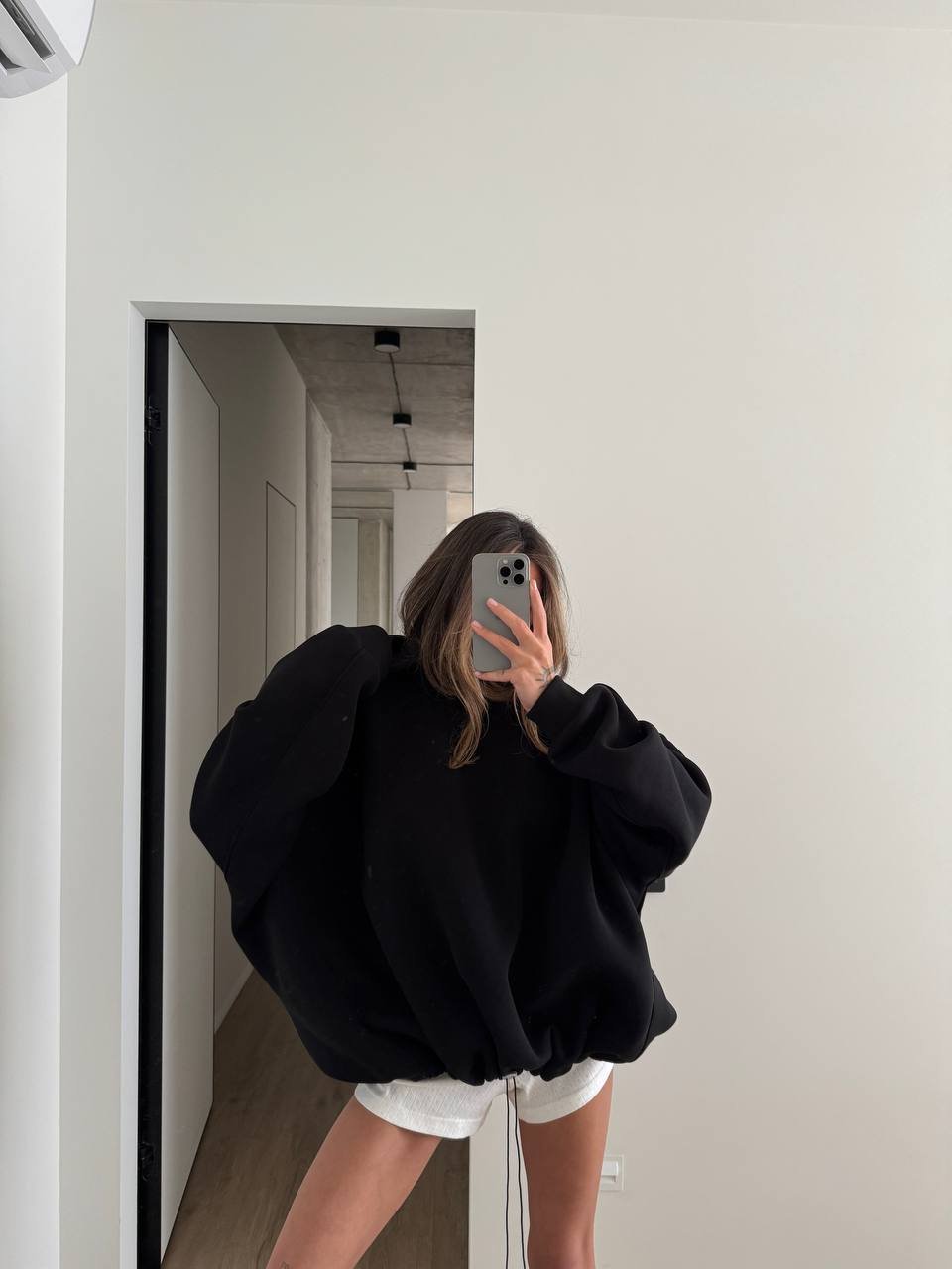 Oversize stiliaus džemperis. 100% medvilnė. Viduje yra švelnus pūkelis. Ilgos rankovės. Apačioje reguliuojasi. Juodos spalvos.