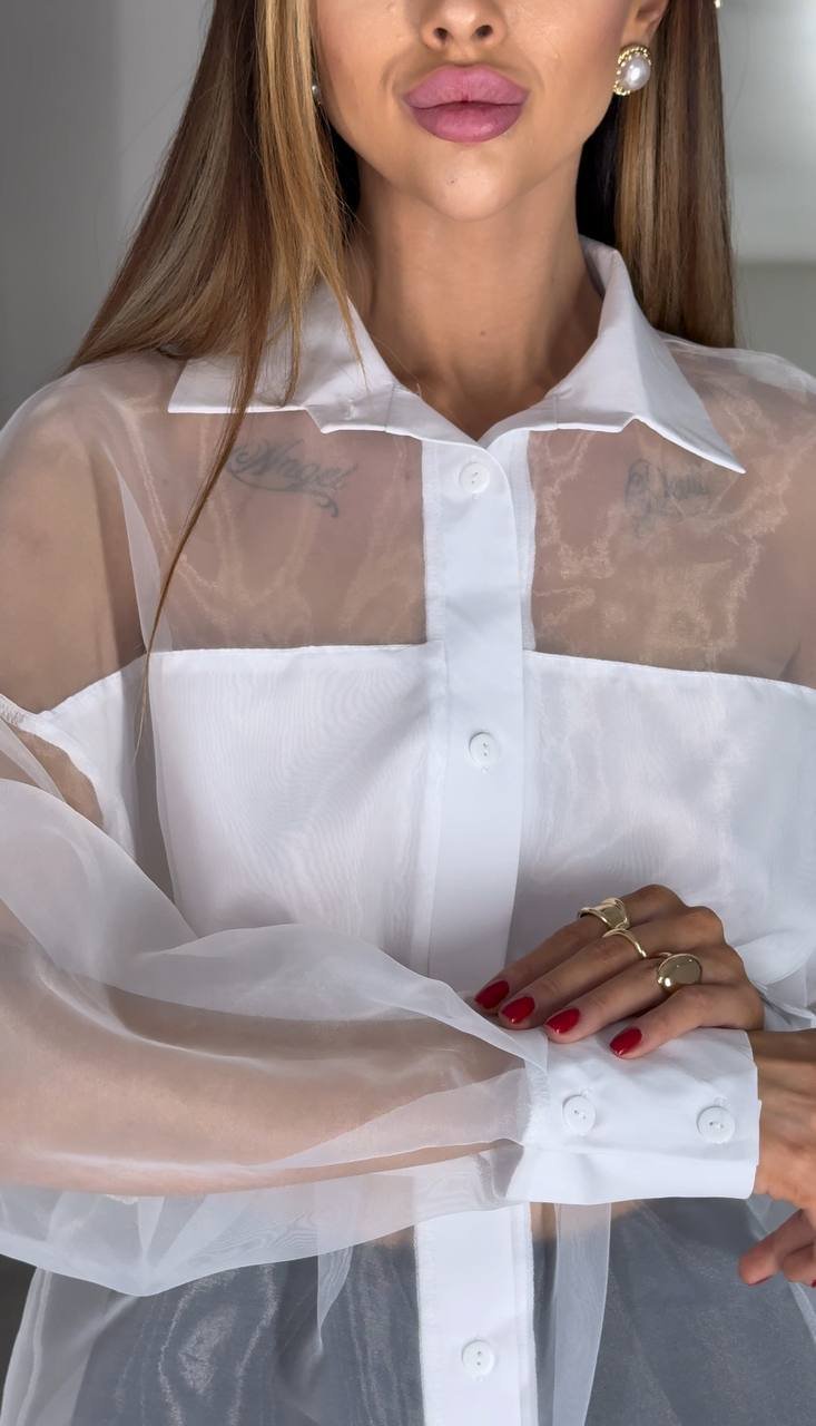 Išskirtinio dizaino marškiniai. Ilgos rankovės. Blizgios medžiagos. Per visą ilgį užsegami sagomis. Liemuo su guma, rišasi dirželis, galite dėvėti ir be. Turime dviejų spalvų. Poliesteris.
