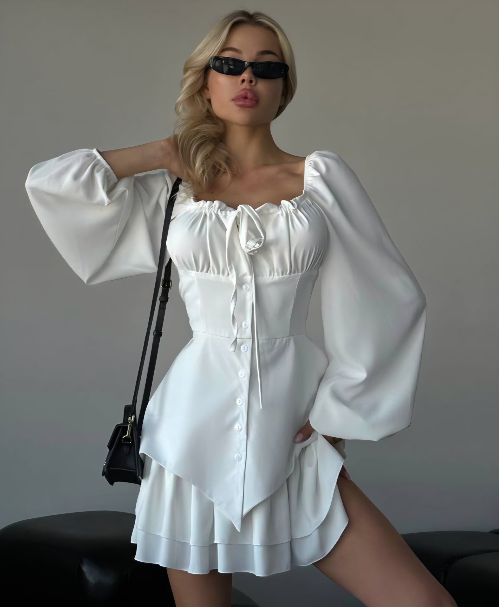 Išskirtinio dizaino suknelė. Krūtinė reguliuojasi. Priekyje užsegama sagomis. Ilgos, plačios rankovės. Standžios medžiagos.