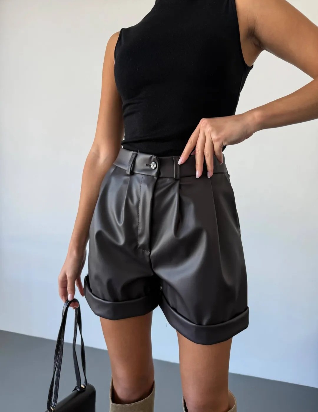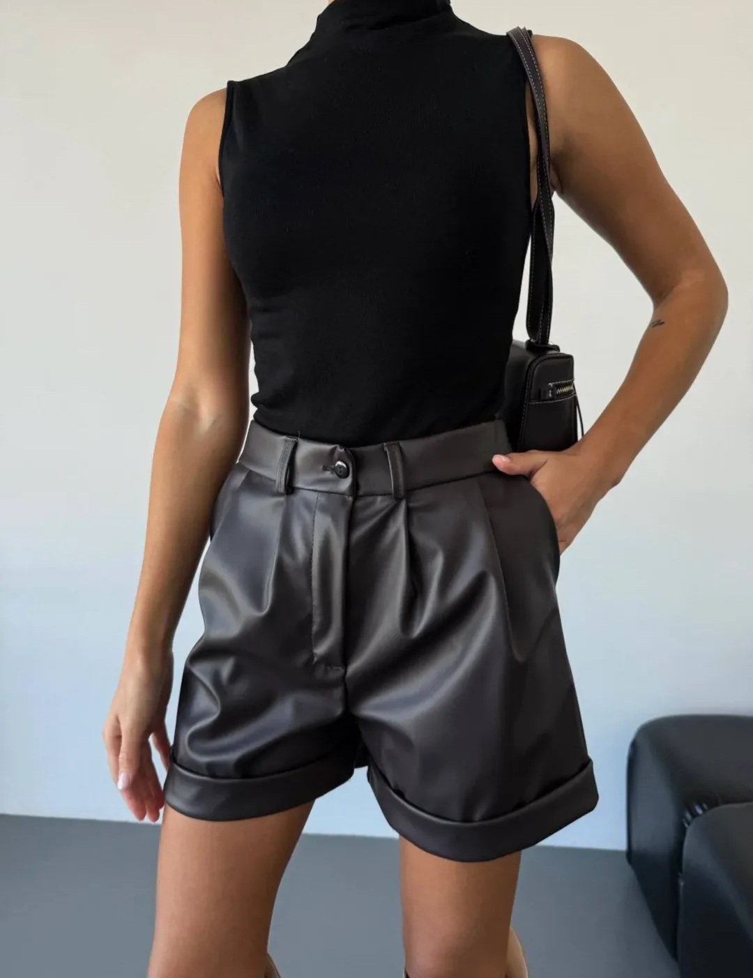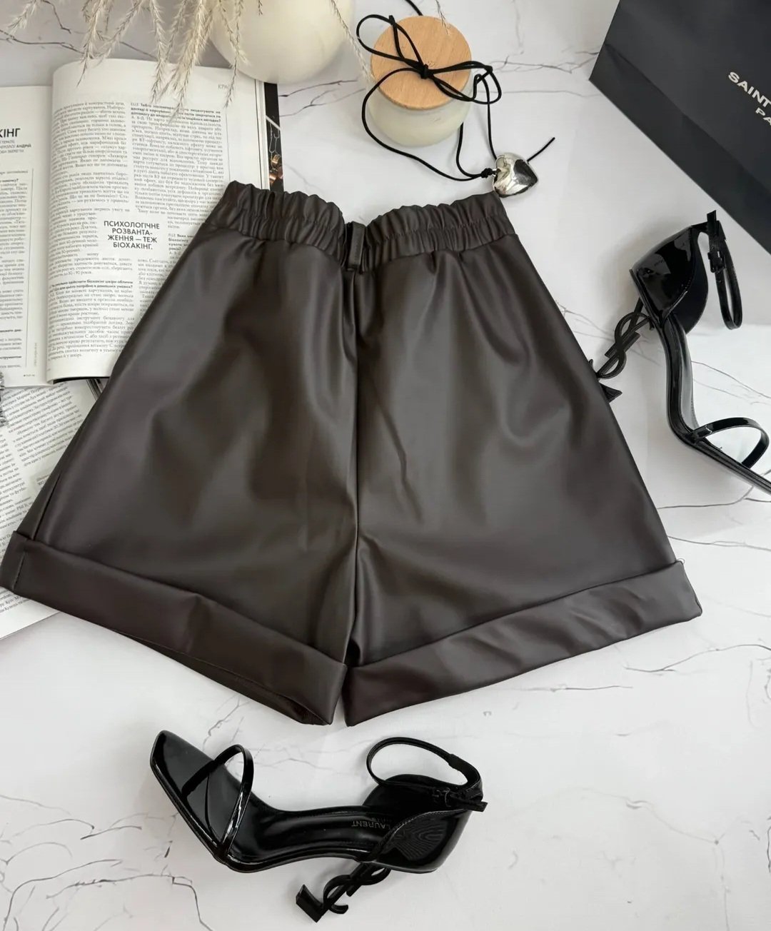 Eco odos šortai. Aukštas liemuo. Užsegami saga ir užtrauktuku. Yra kišenės. Standžios, kokybiškos medžiagos. Turime dviejų spalvų: juodos, tamsiai rudos.