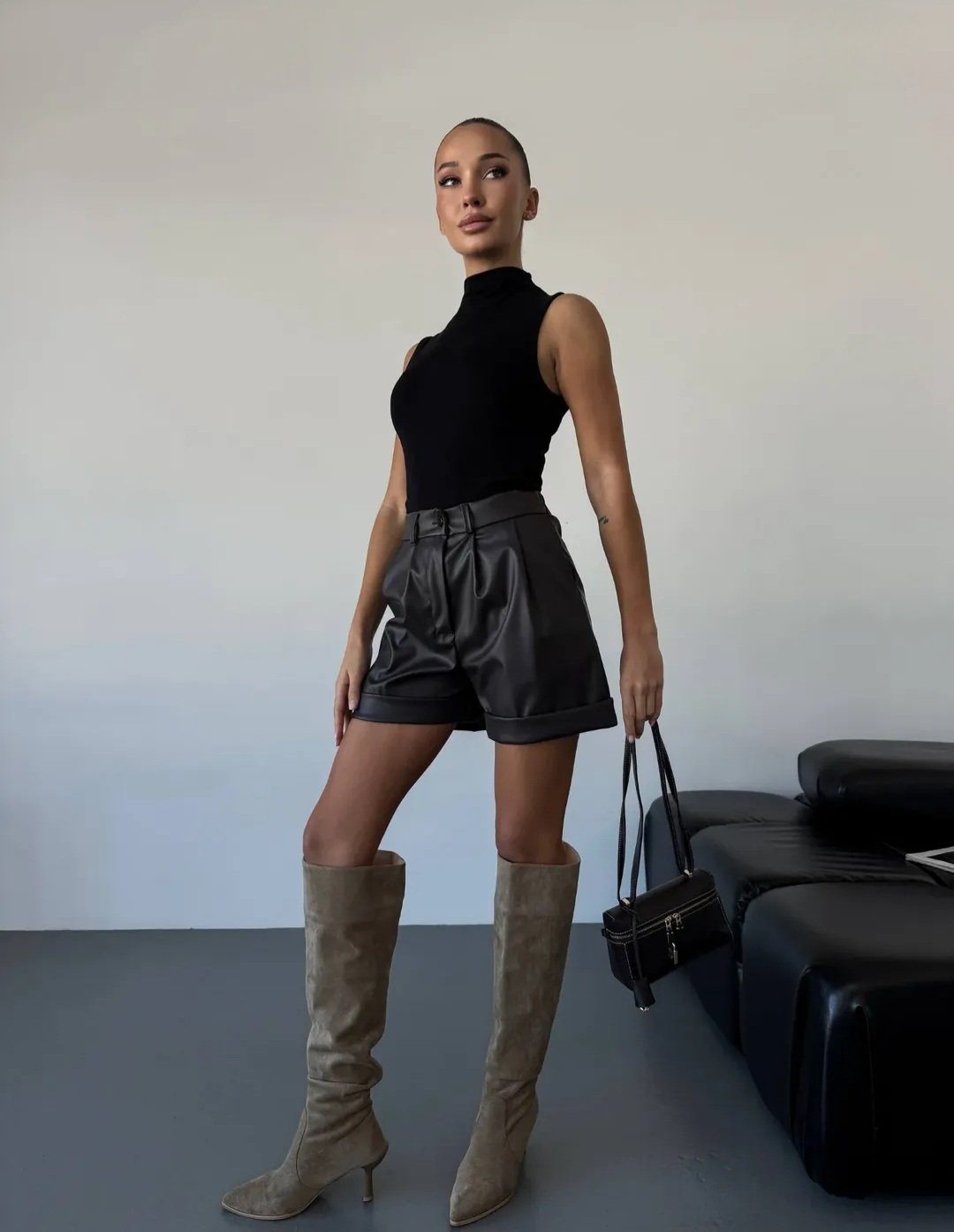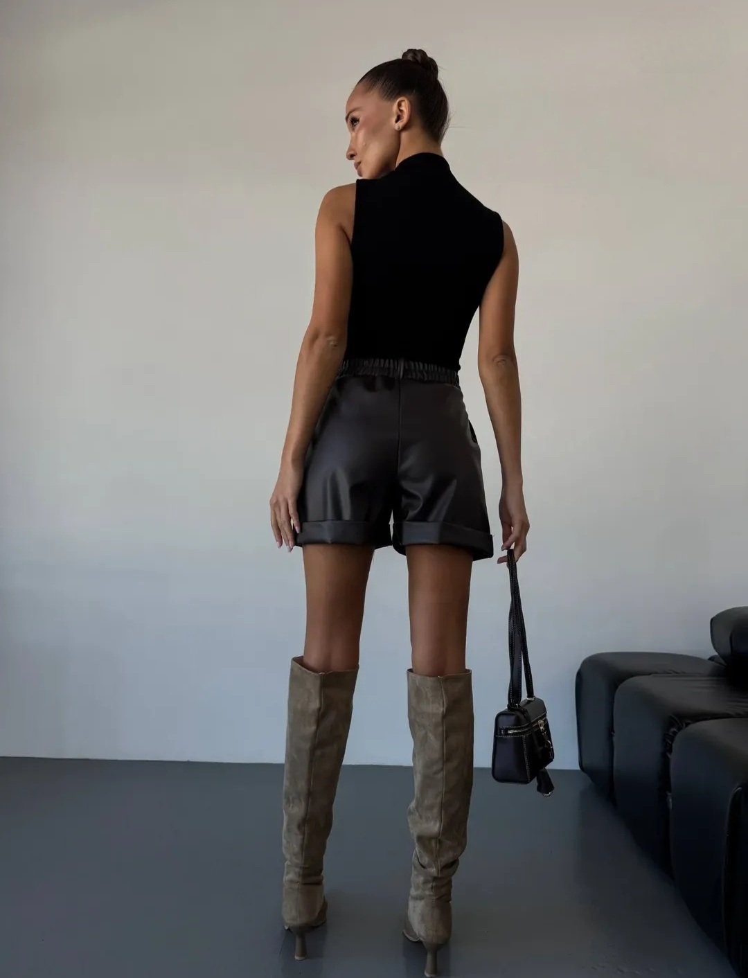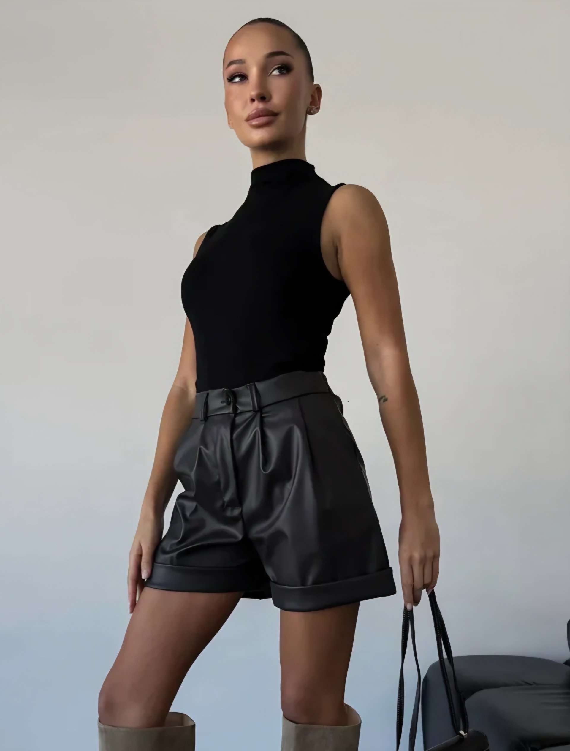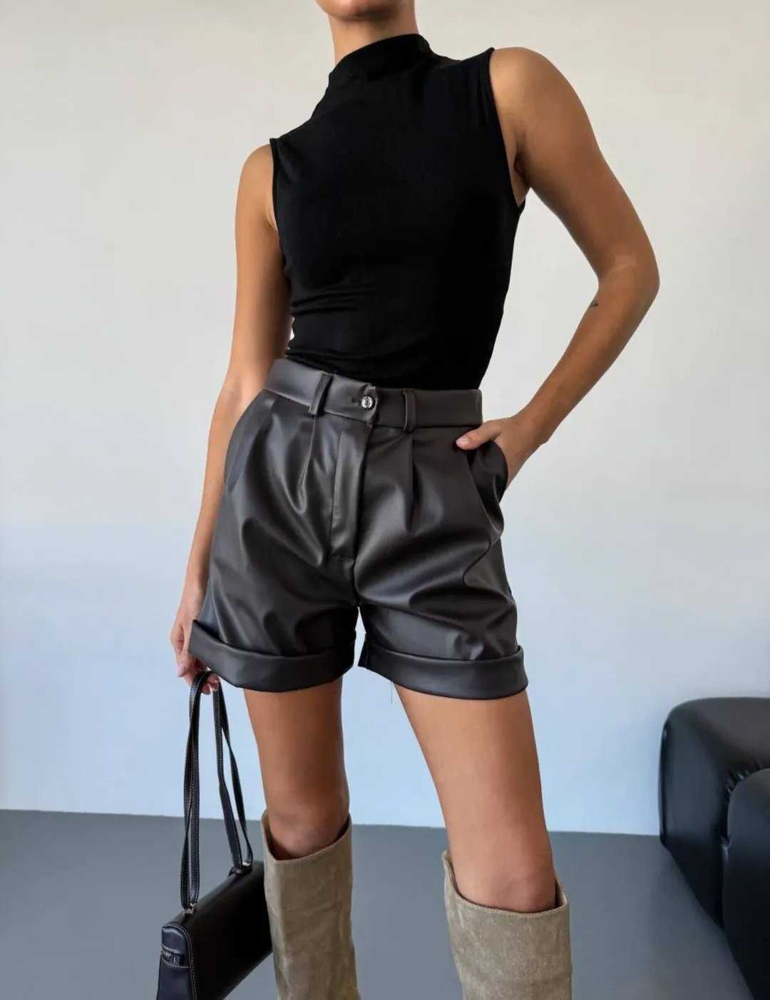 Eco odos šortai. Aukštas liemuo. Užsegami saga ir užtrauktuku. Yra kišenės. Standžios, kokybiškos medžiagos. Turime dviejų spalvų: juodos, tamsiai rudos.