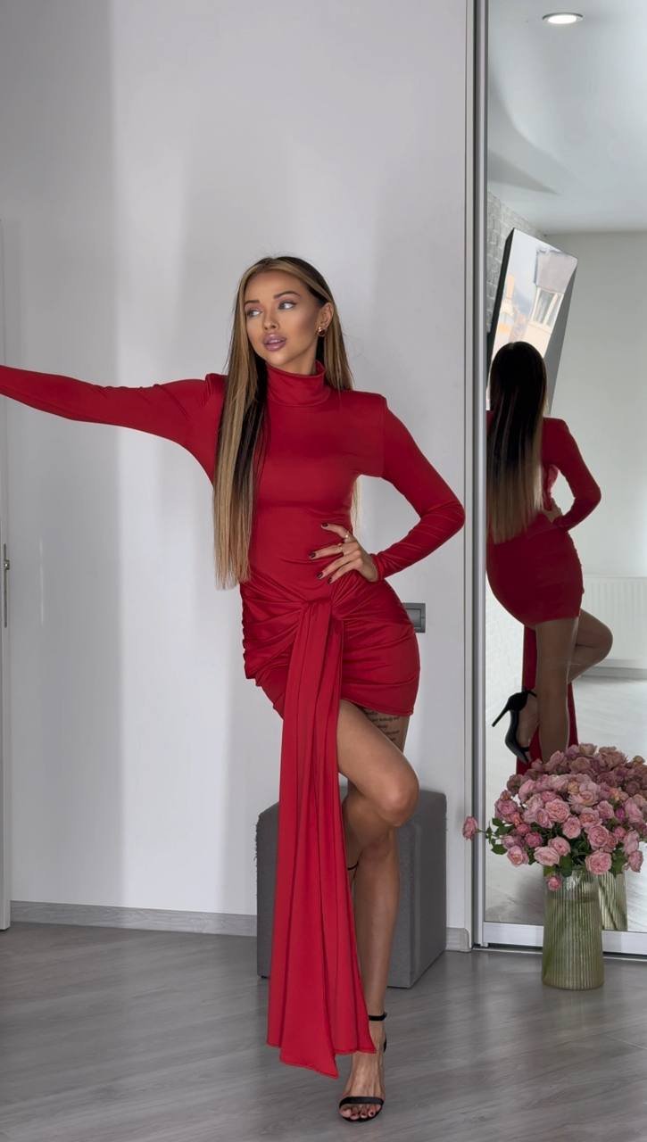 Puošni išskirtinio dizaino suknelė. Ilgos rankovės. Tamprios medžiagos. Raudonos spalvos. Ties liemeniu surišama. Aukštu kaklu. Turime trijų skirtingų spalvų.