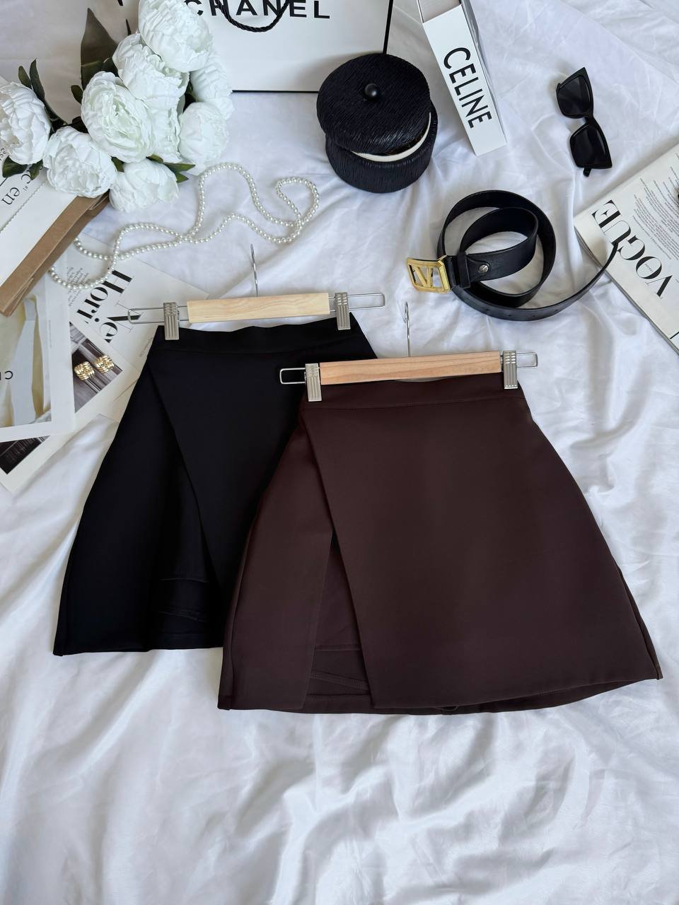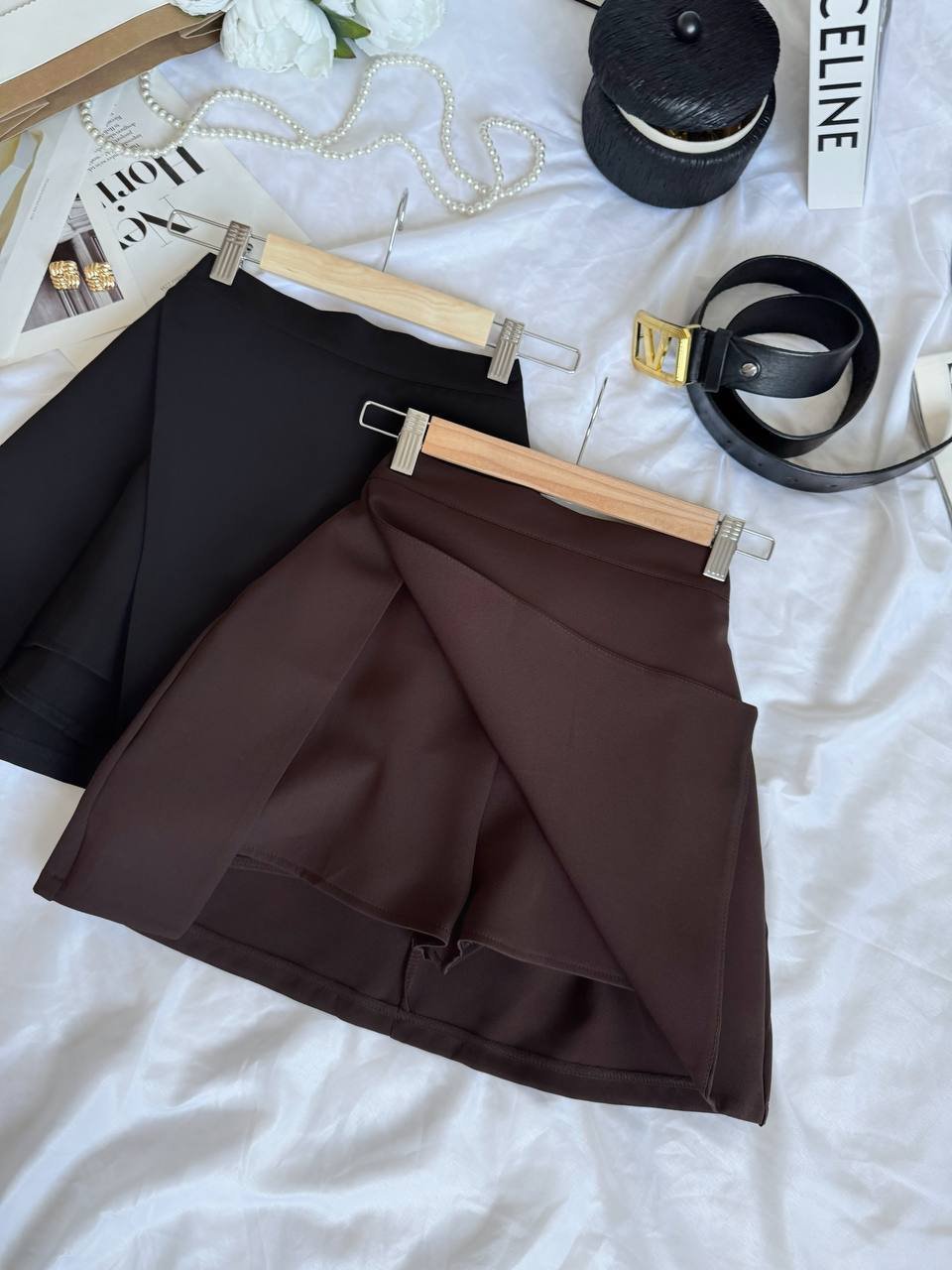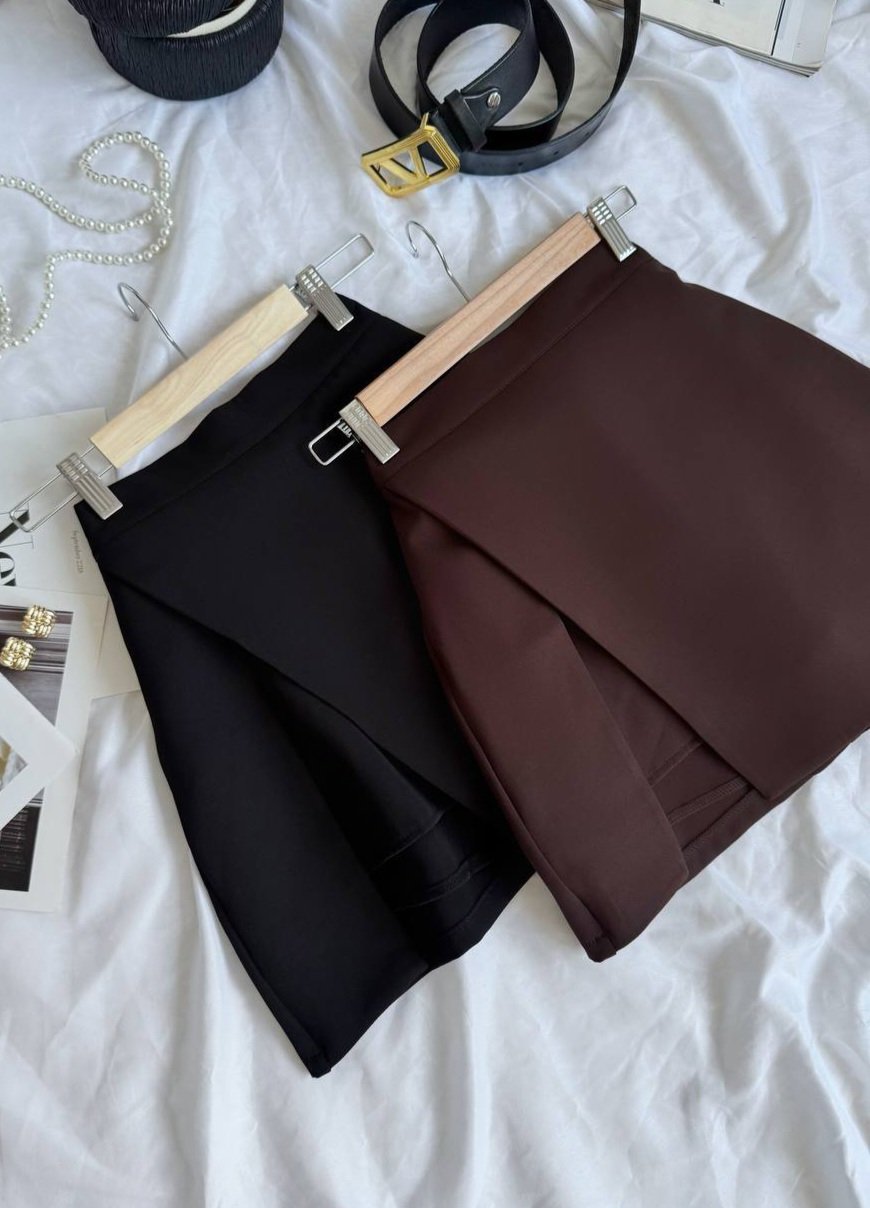 Aukšto liemens sijonas. Apačioje yra šortai. Rudos spalvos. Poliesteris.
