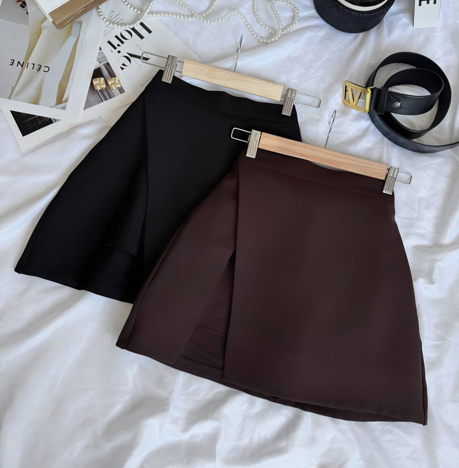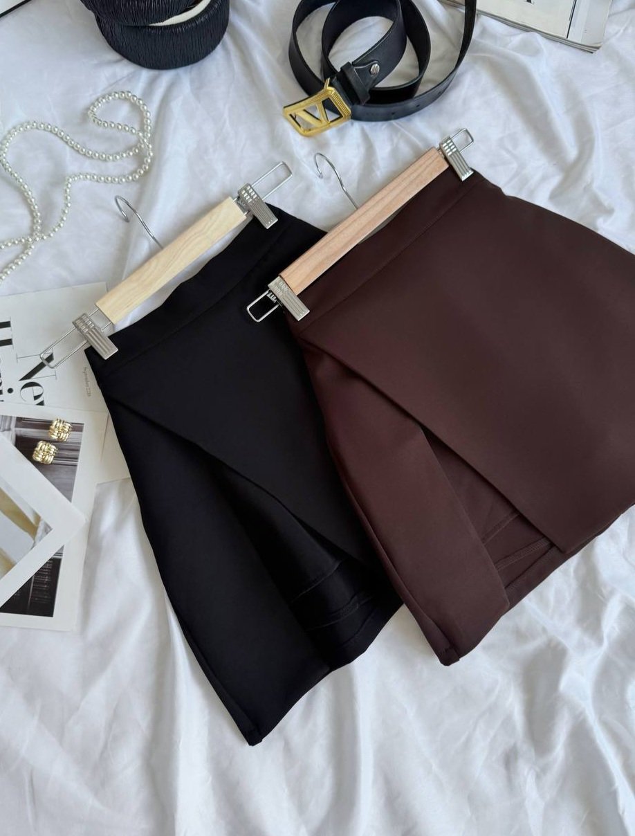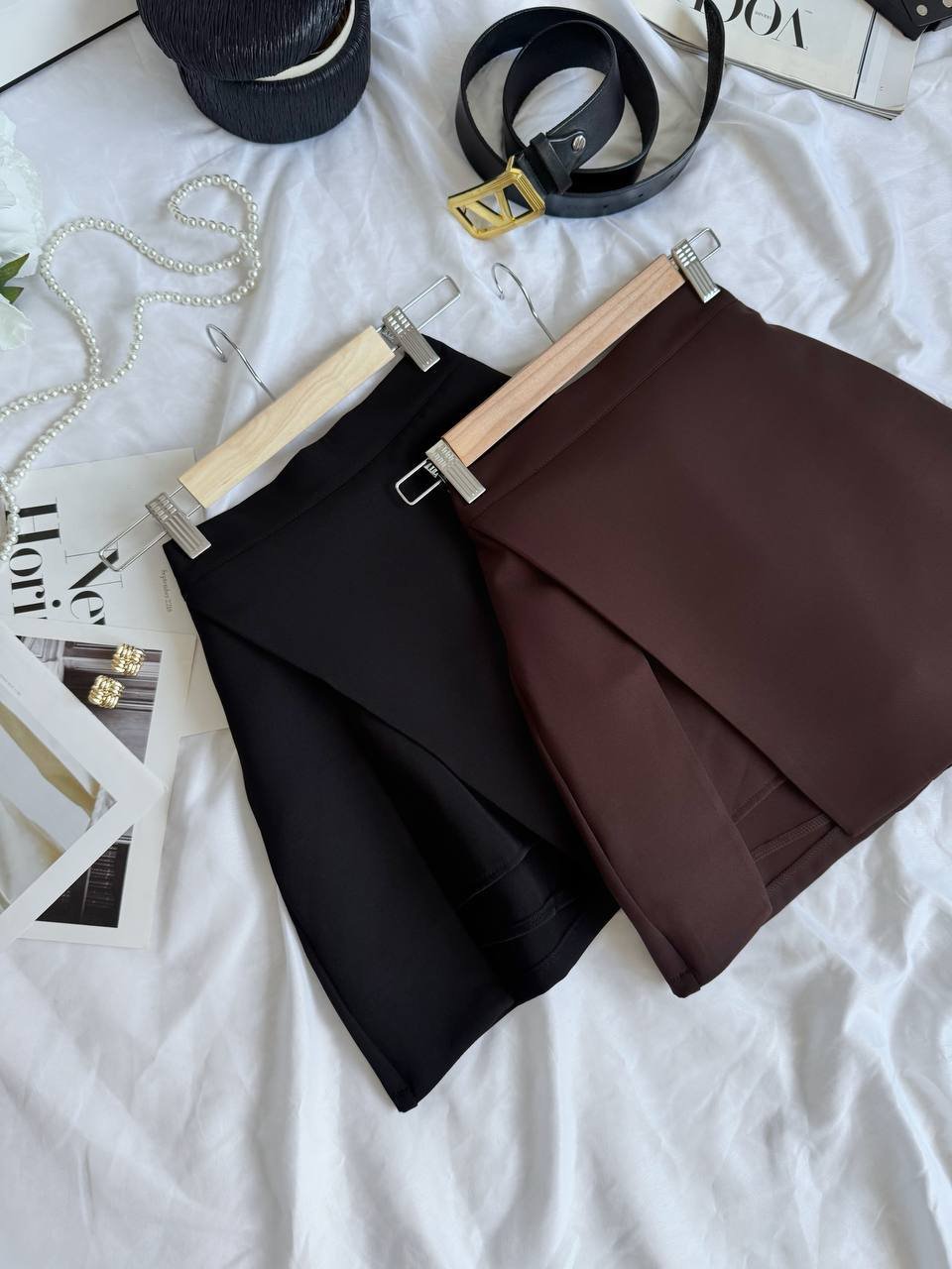 Aukšto liemens sijonas. Apačioje yra šortai. Rudos spalvos. Poliesteris.