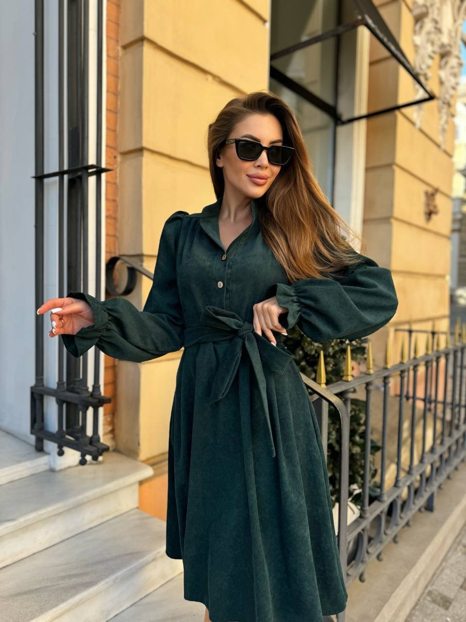 Ilgos rankovės. Per liemenį rišasi diržas. Užsegama sagomis. Galima dėvėti be diržo.