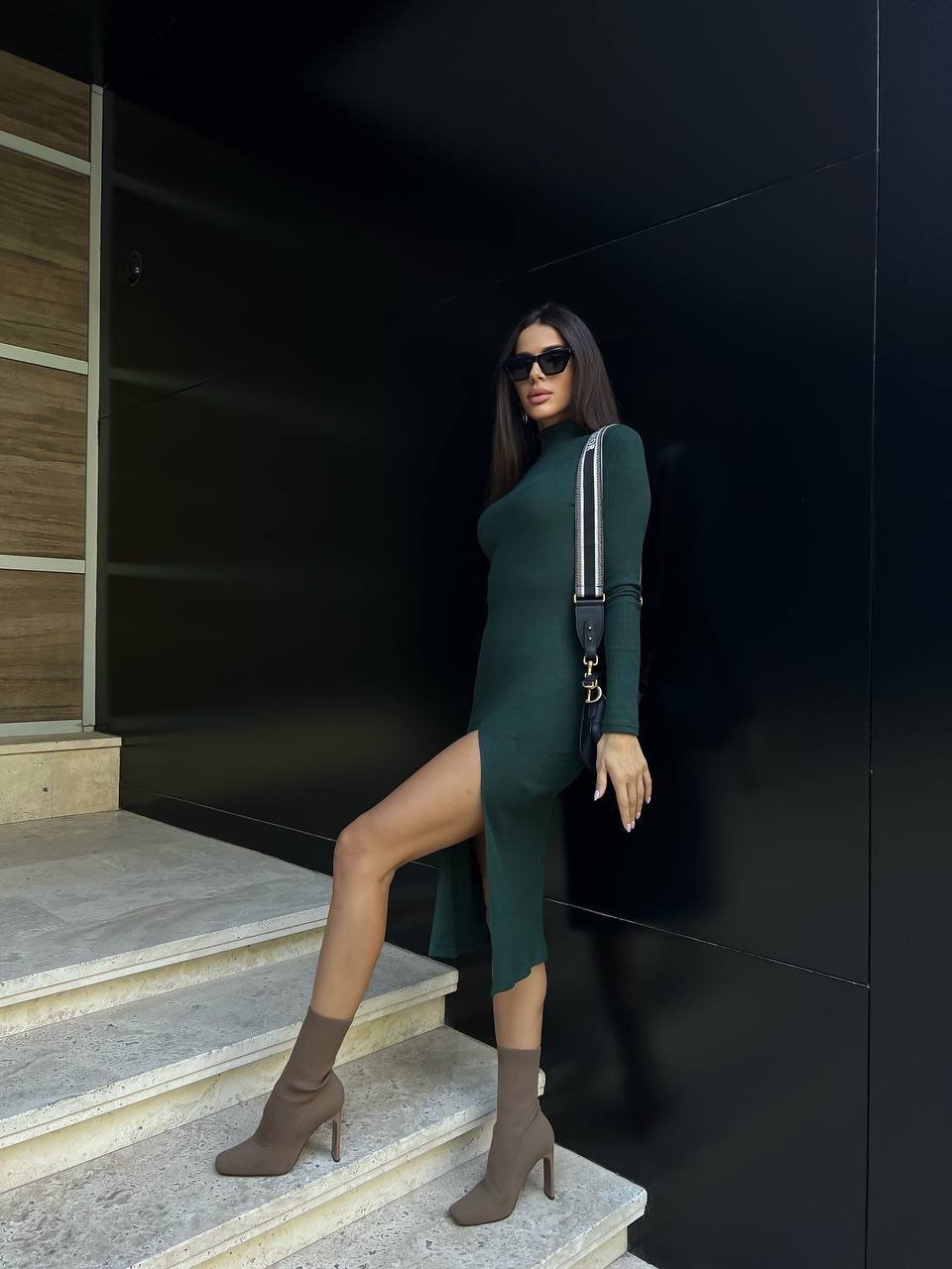Suknelė su skeltuku. Ilgos rankovės. Šiek tiek aukštesnis kaklas. Tamprios medžiagos. Tamsiai žalios spalvos. 70% viskozė, 30% poliamidas.