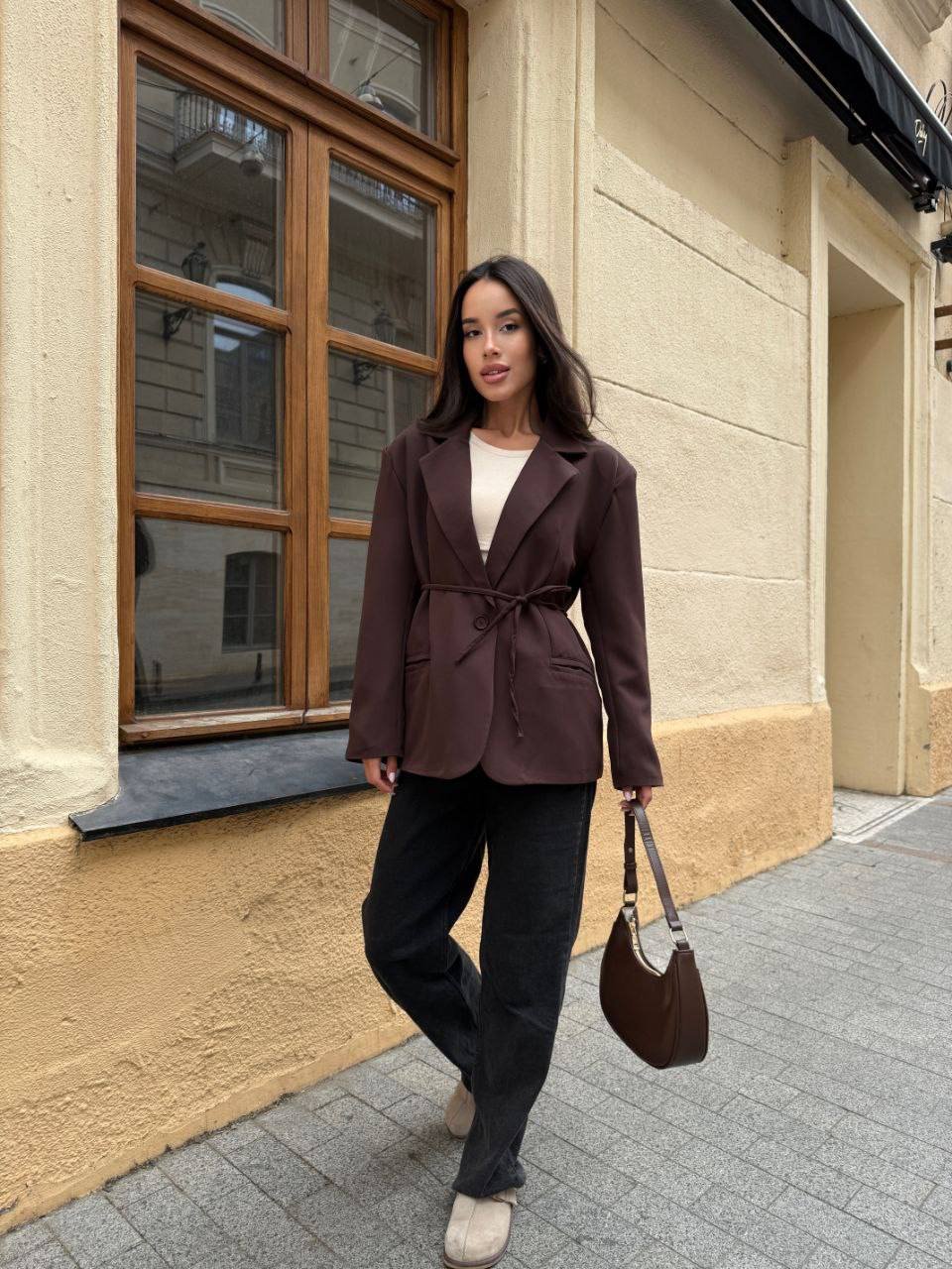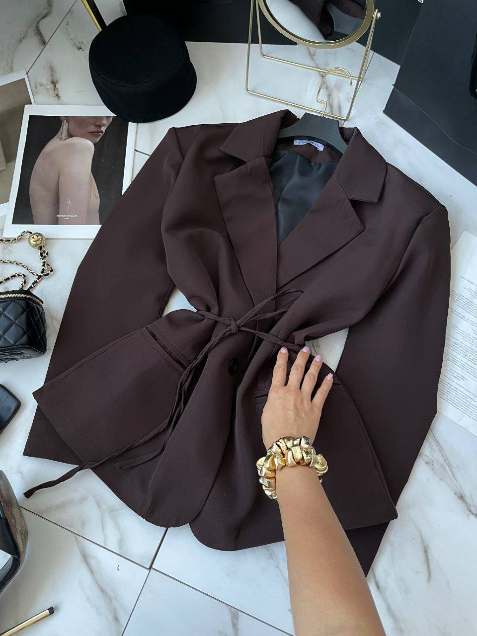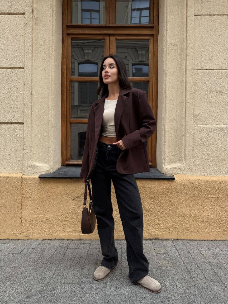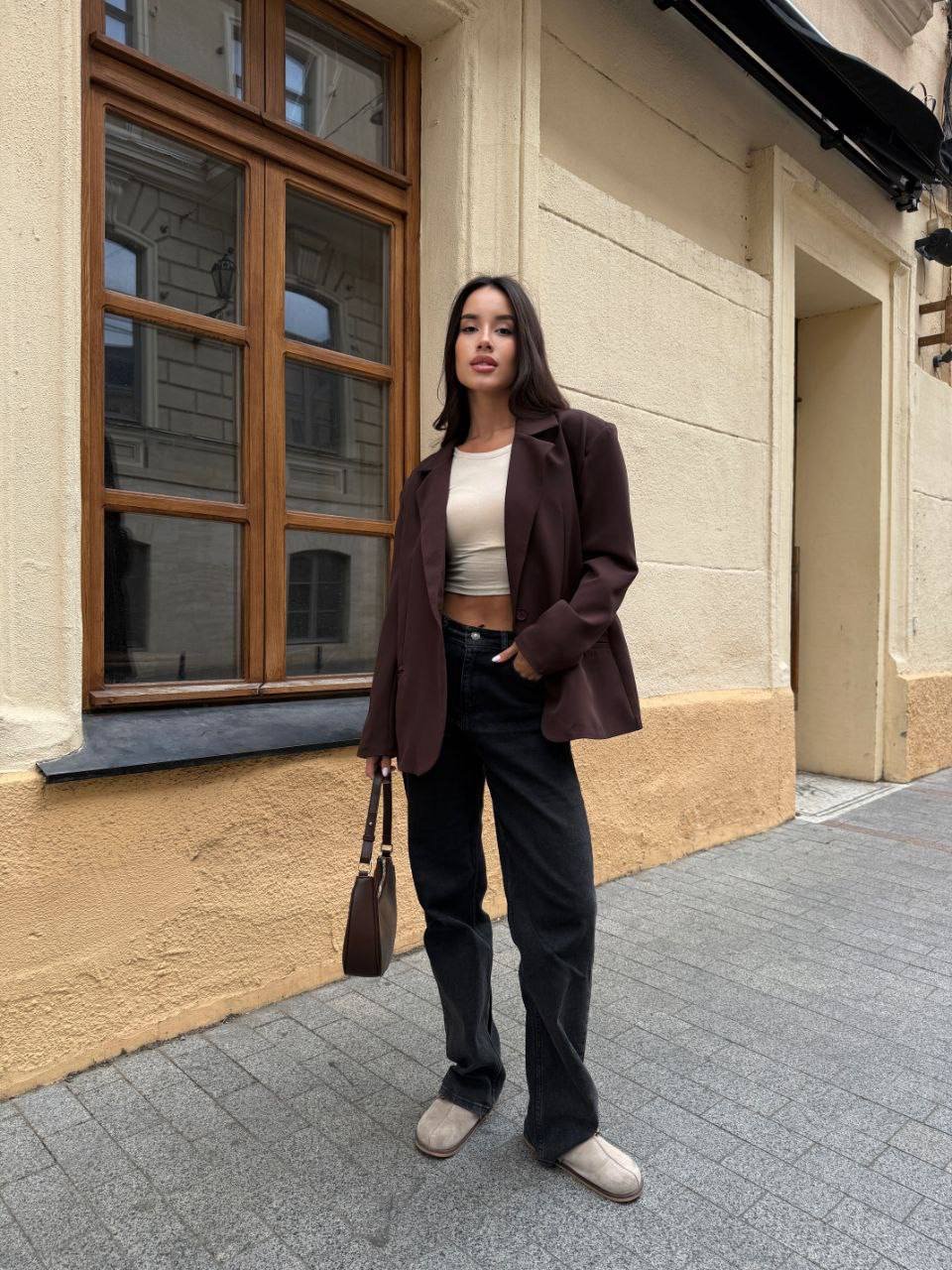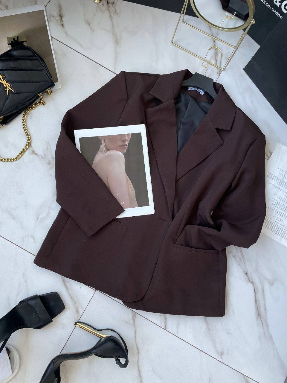 Oversize stiliaus švarkas. Ilgos rankovės. Užsegamas saga. Su pamušalu, pečiai su pakietinimais. Turime dviejų spalvų: rudos, juodos.